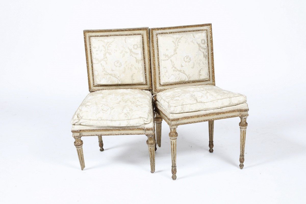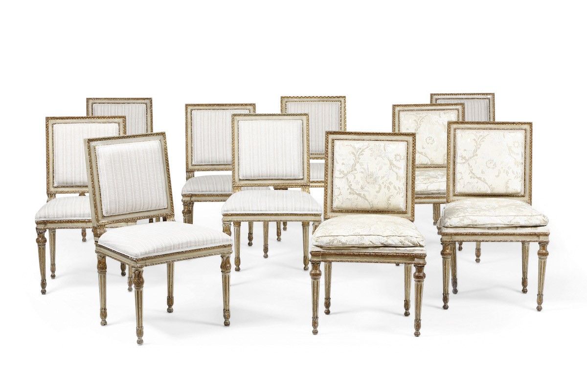 Lotto di 12 sedie in legno intagliato, laccato e dorato. XVIII-XIX-secolo