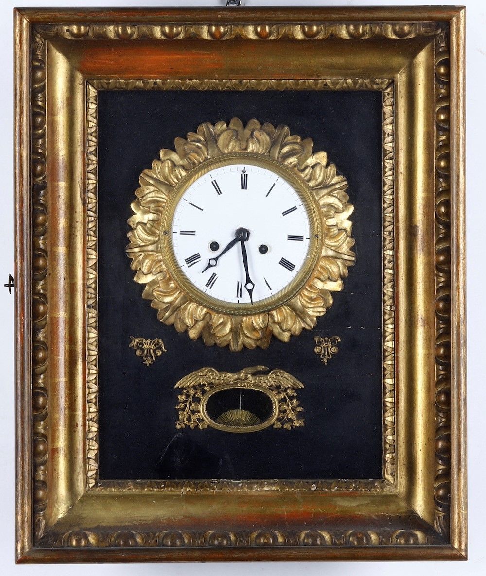 Orologio da parete in legno intagliato e dorato. Austria, XIX secolo