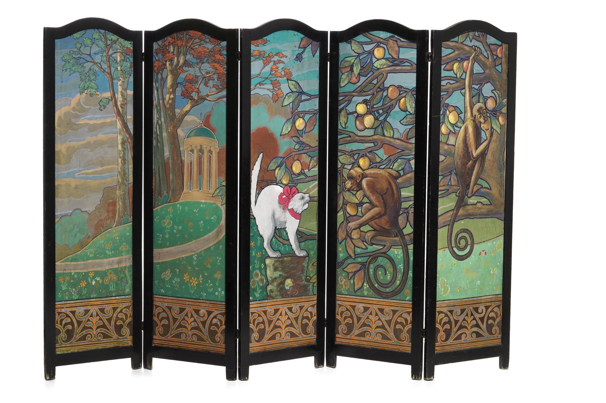 Paravento in legno ebanizzato dipinto in policromia con paesaggio con scimmie e [..]