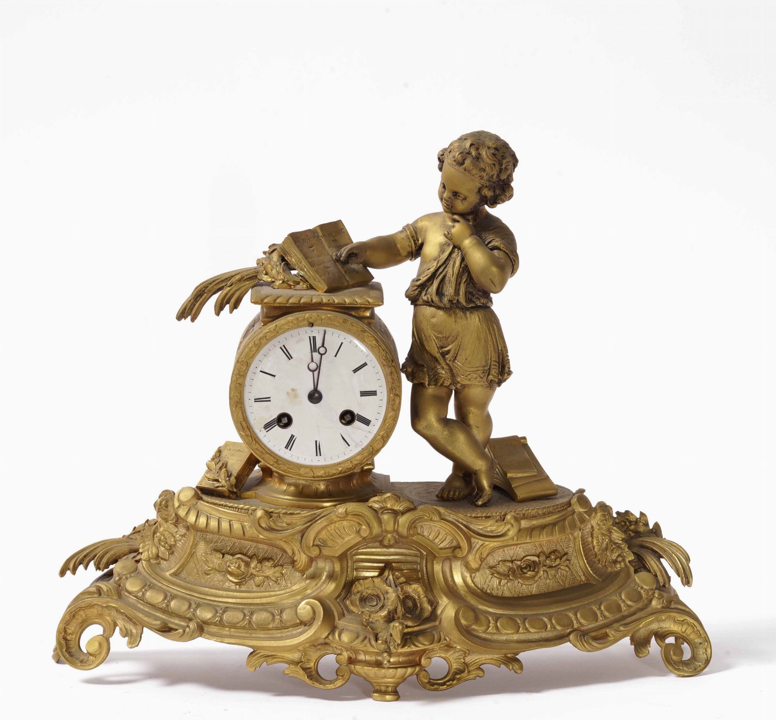 Pendola da tavolo in bronzo dorato dorato con fanciullo che legge un libro. XIX-XX [..]