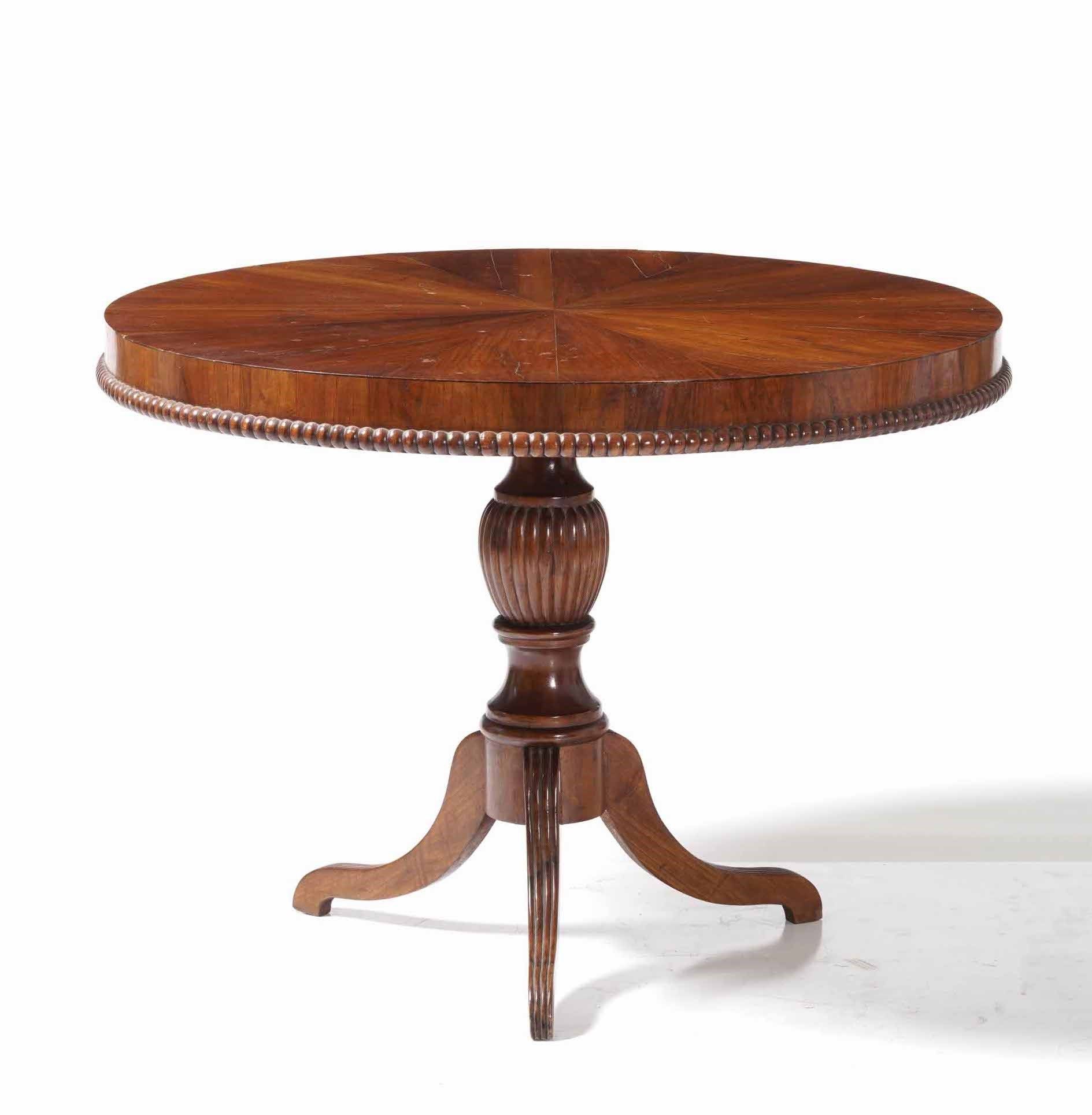 Tavolo in legno con piano circolare lastronato. XIX secolo
