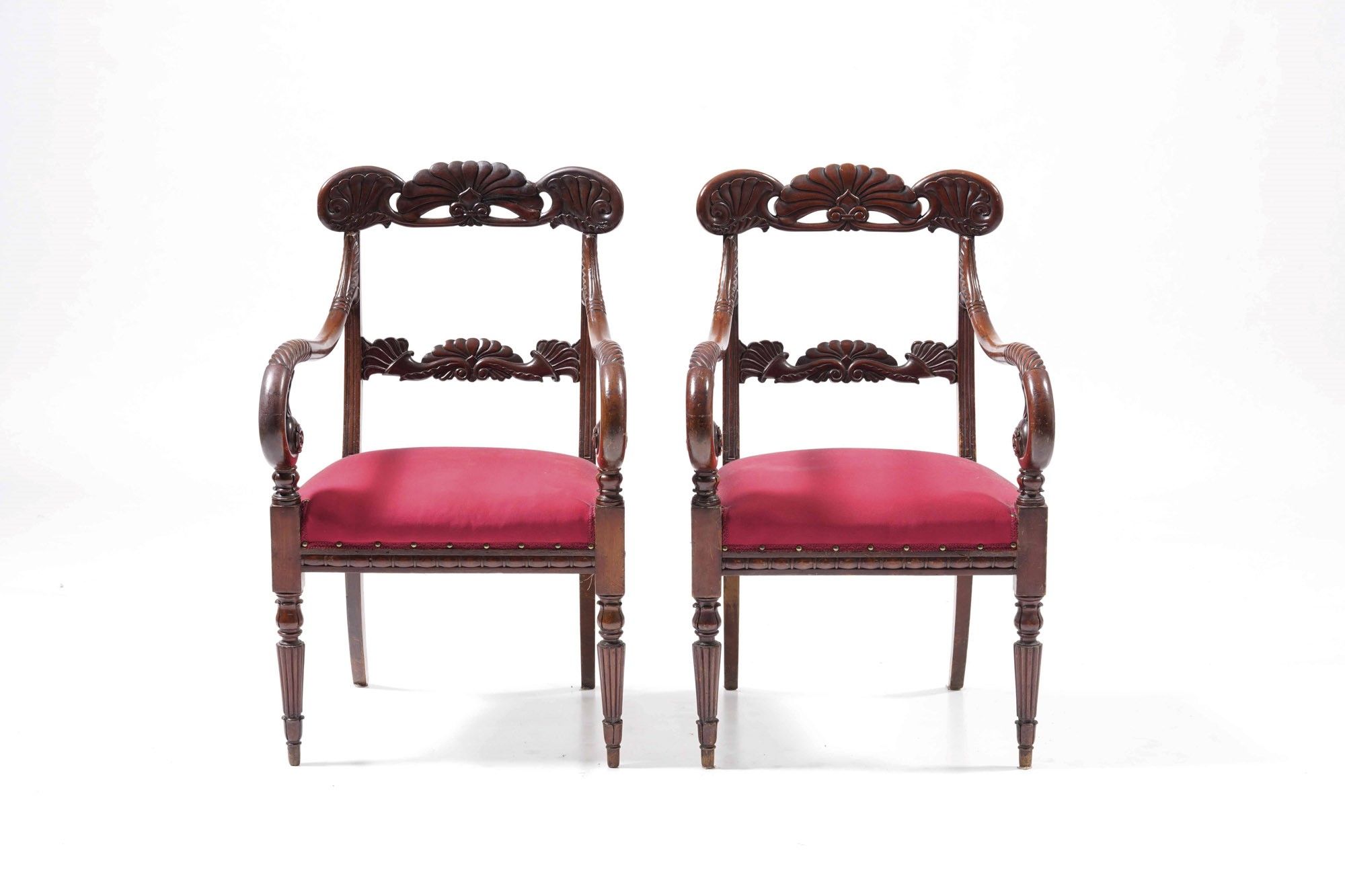 Tavolo in legno con sei sedie e due poltrone in legno intagliato. XIX secolo