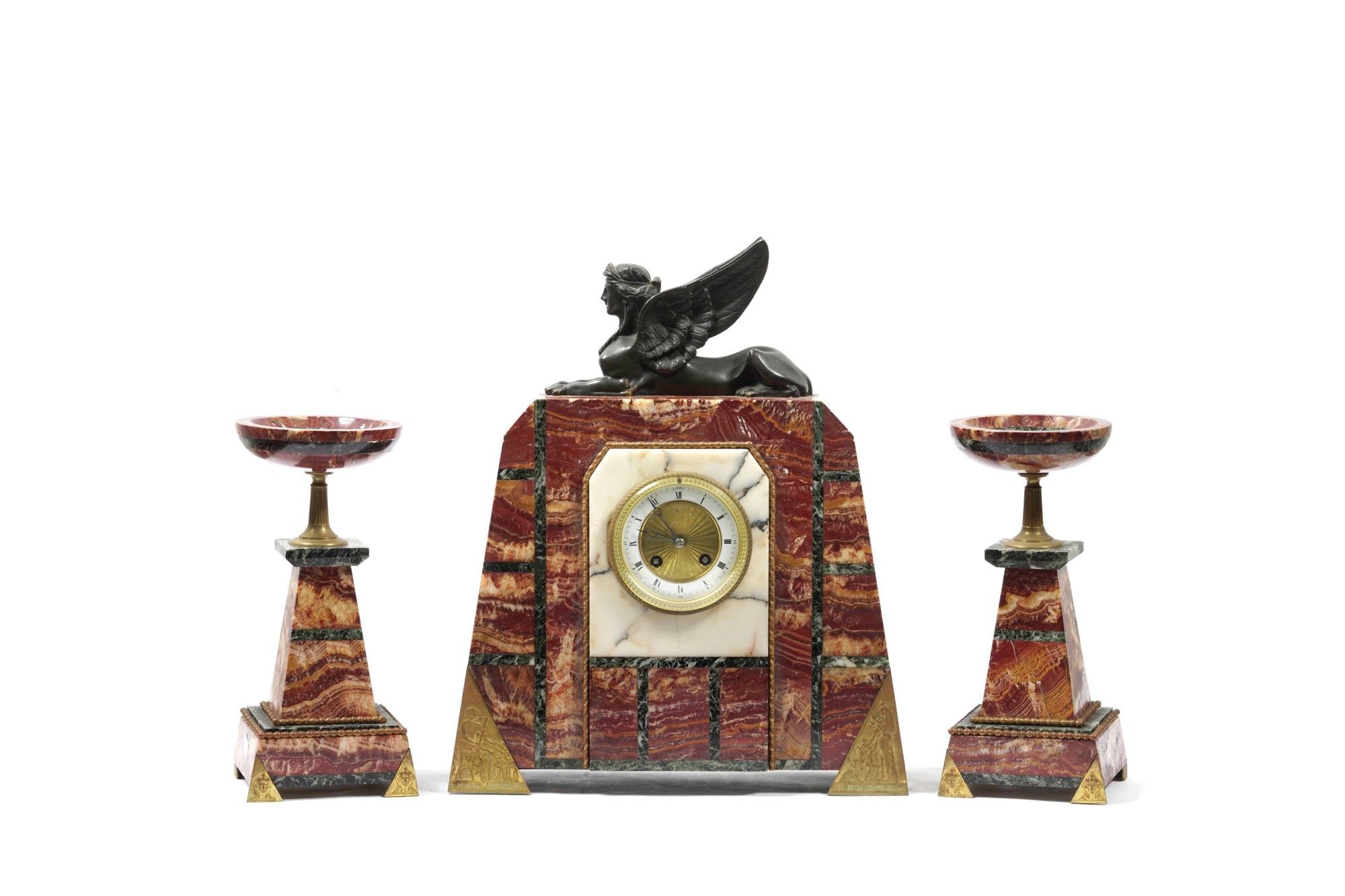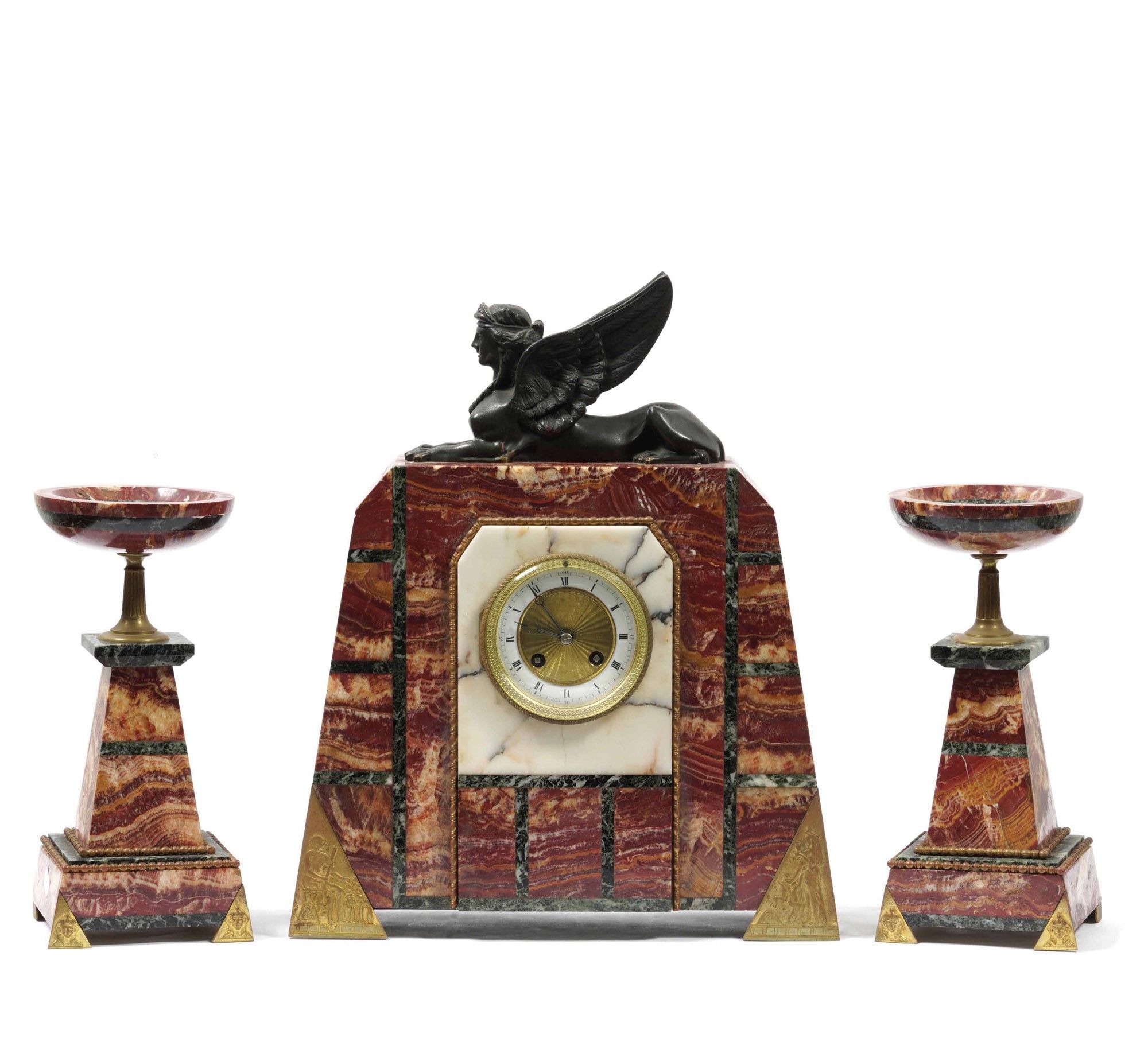 Trittico Déco conposto da orologio e coppia di coppe. Marmo e bronzo. XX secolo