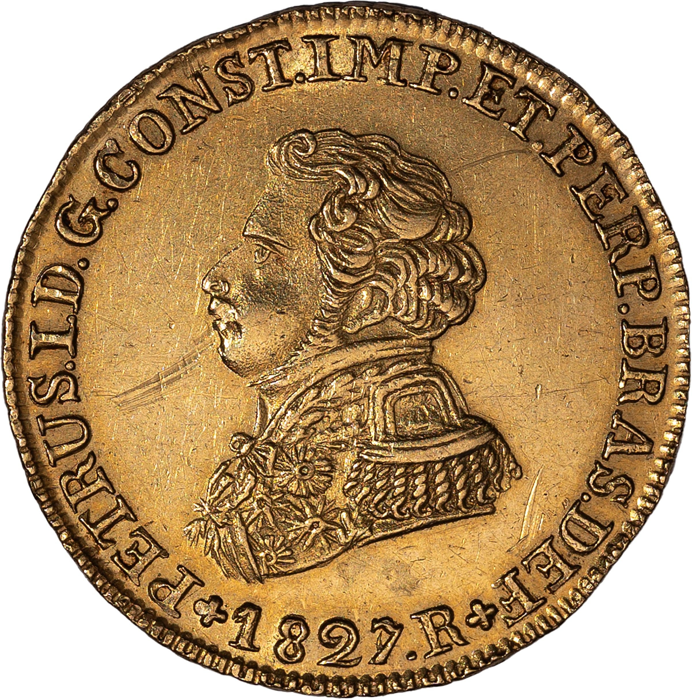 1827 D/ effigie del sovrano a s., R/ stemma coronato fra due rami annodati alla base, Zecca di Rio de Janeiro; Metallo: AV, gr. 7,90, Diam.: mm. 26,13. BB.