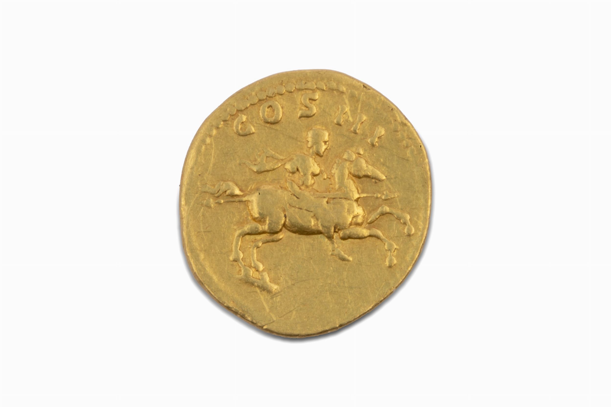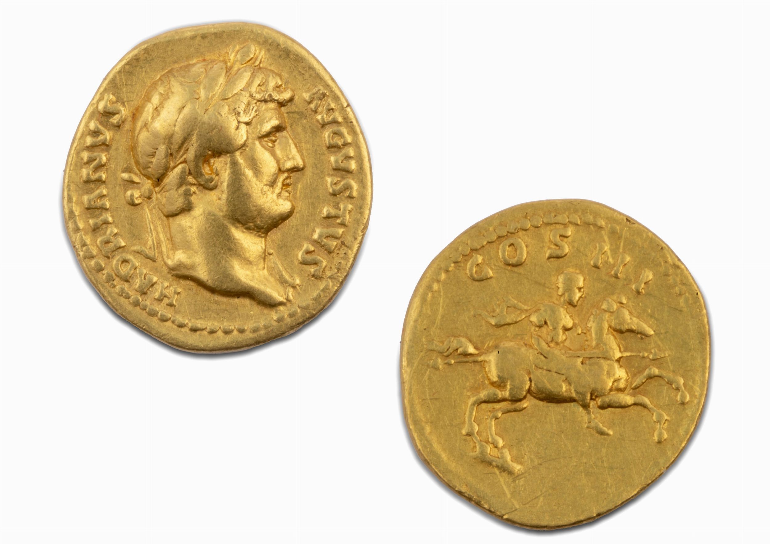 125-128 d.C., D/ HADRIANVS AVGVSTVS, testa laureata a d., con tracce di paludamento sulla spalla s., R/ COS III, Adriano a cavallo a d. con lancia nella d., Zecca di Roma, Rif. bibl. R.I.C., 187d; Cohen, 414/Fr.40; Calic̣, 1224; Metallo: AV, gr. 7,12, Diam. 20,24 mm. BB