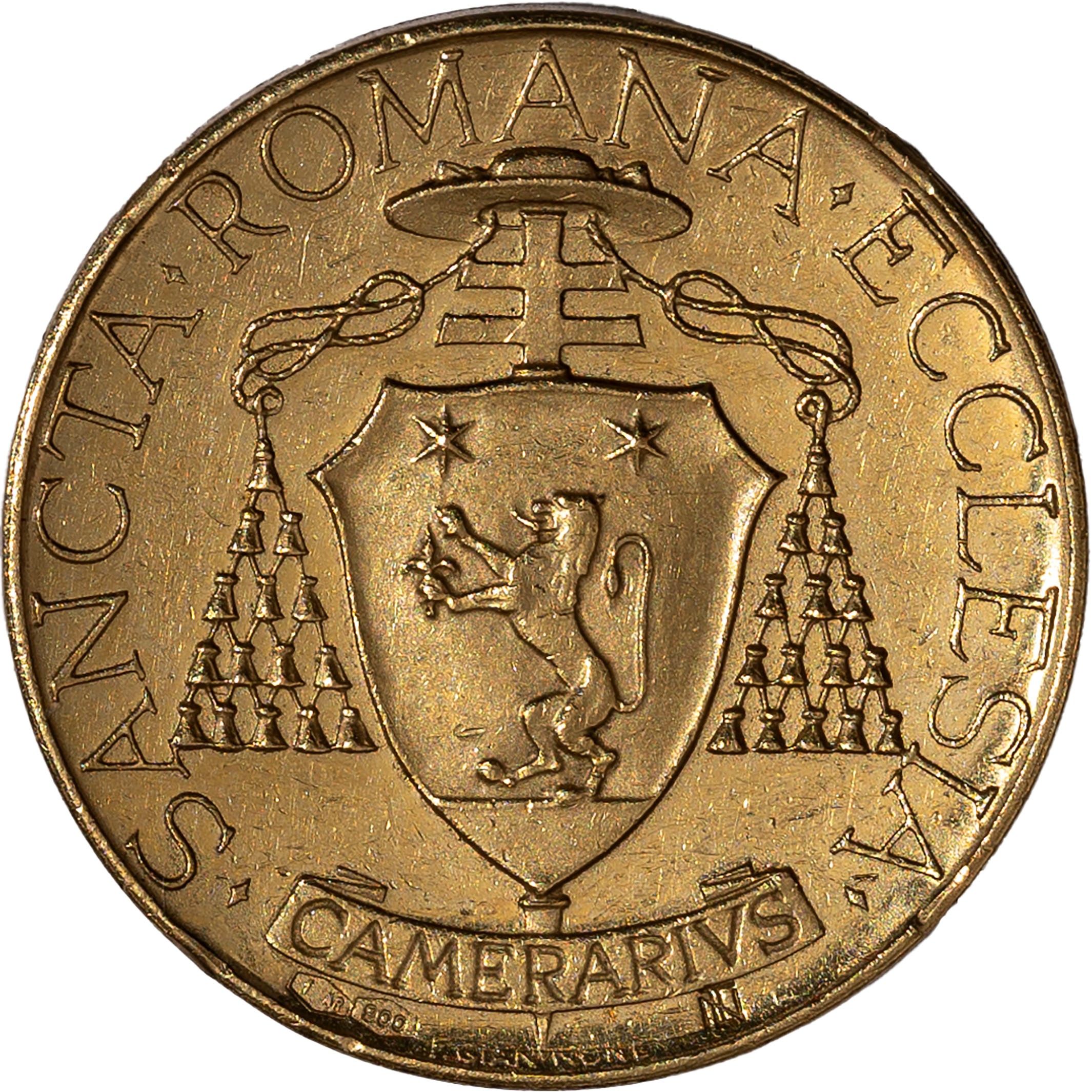 D/ SANCTA ROMANA ECCELSIA Stemma del Cardinale Benedetto Aloisi-Masella; sotto, nastro su cui CAMERARIVS; sotto ancora, F GIANNONE. R/ SEDE VACANTE MCMLXIII Padiglione e chiavi decussate. Boccia 125 F. Emissione non ufficiale; Metallo: AV, gr. 8,06, Diam: mm. 22,82. BB.