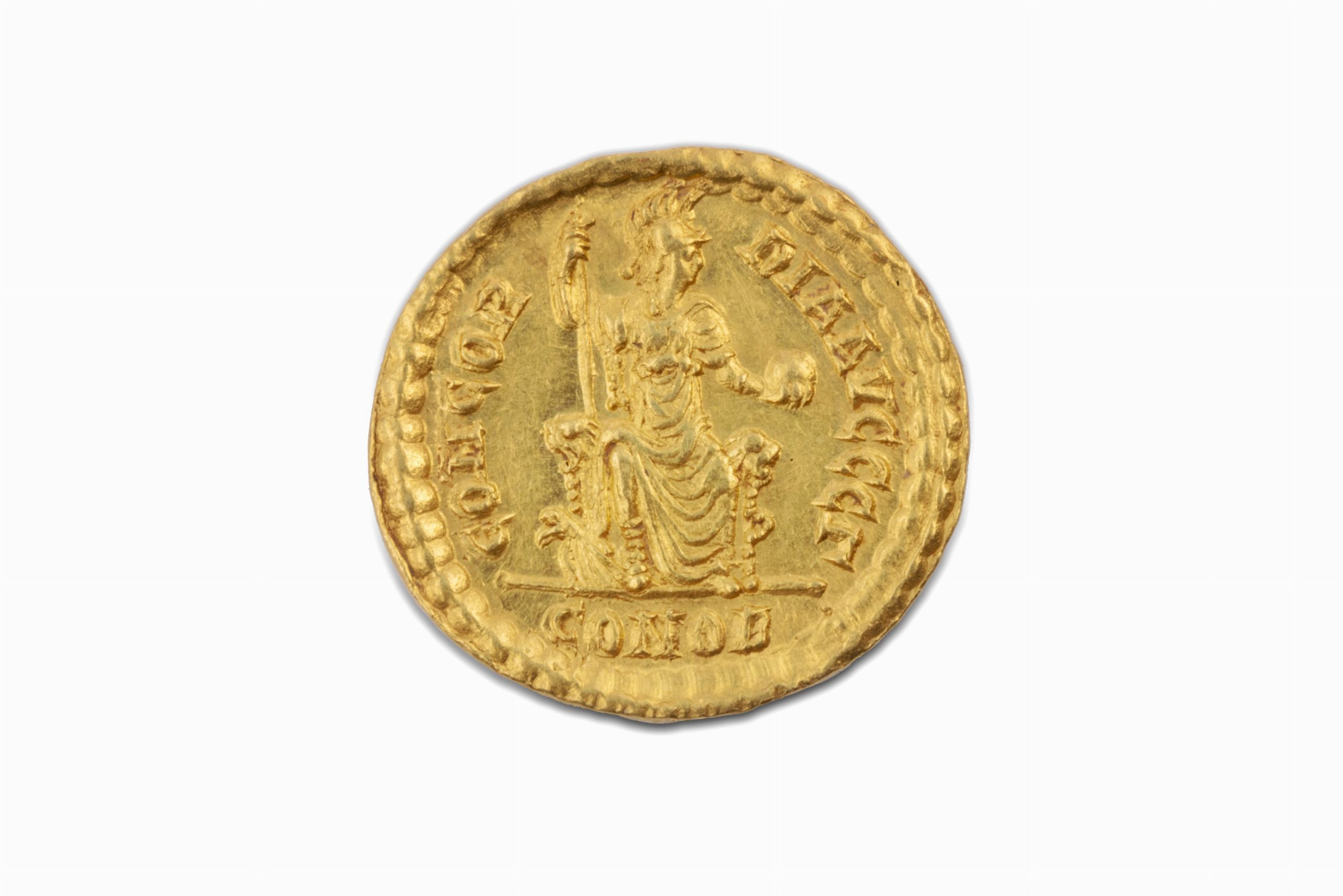 378-383 d.C., D/ D N THEODOSIVS P F AVG, Busto diademato con paludamento e corazza a d., R/ CONCORDIA AVGGGI, CONOB, Costantinopoli galeata seduta di fronte su di un alto trono, volta a d., tiene lo scettro nella d. ed il globo nella s., Zecca di Costantinopoli, Rif. bibl. R.I.C., 43b/R2; Cohen, 7/Fr.20; Metallo: AV, gr. 4,45, Diam.: mm. 20,94, SPL.