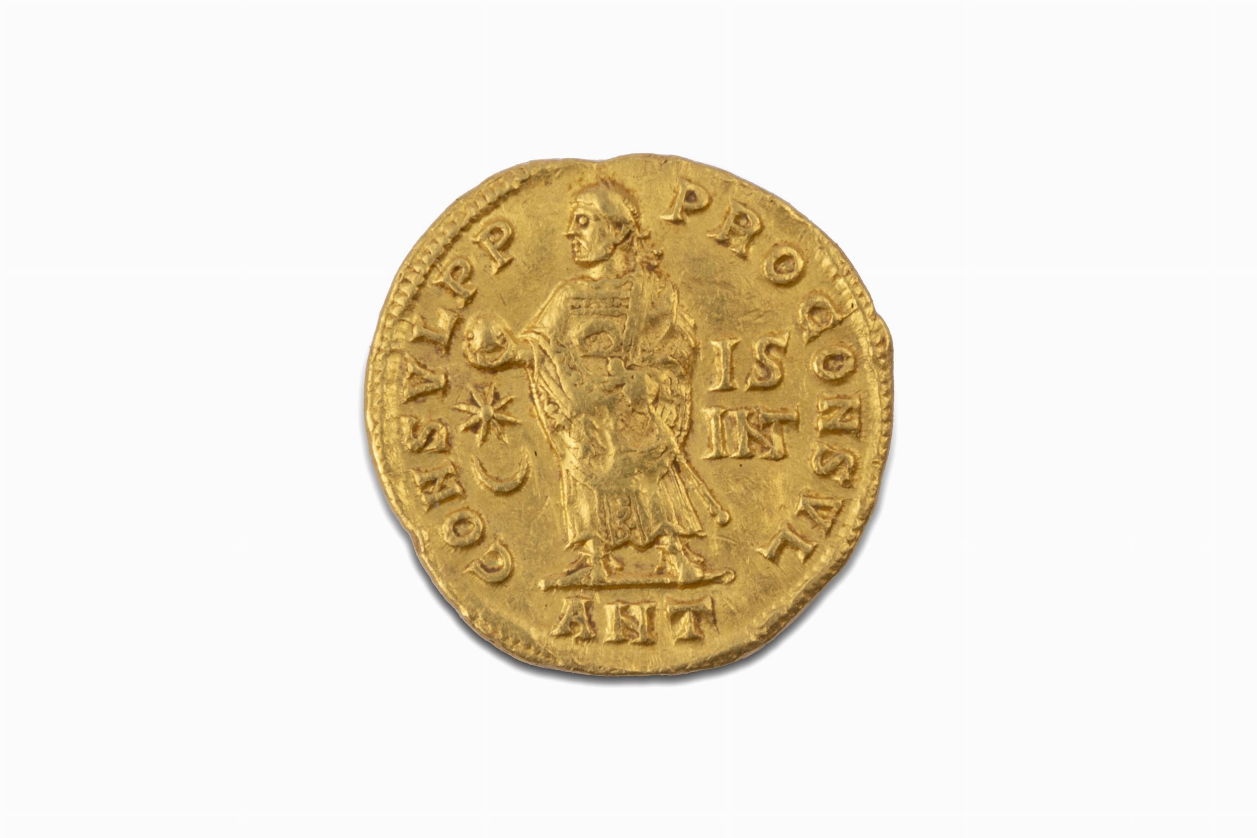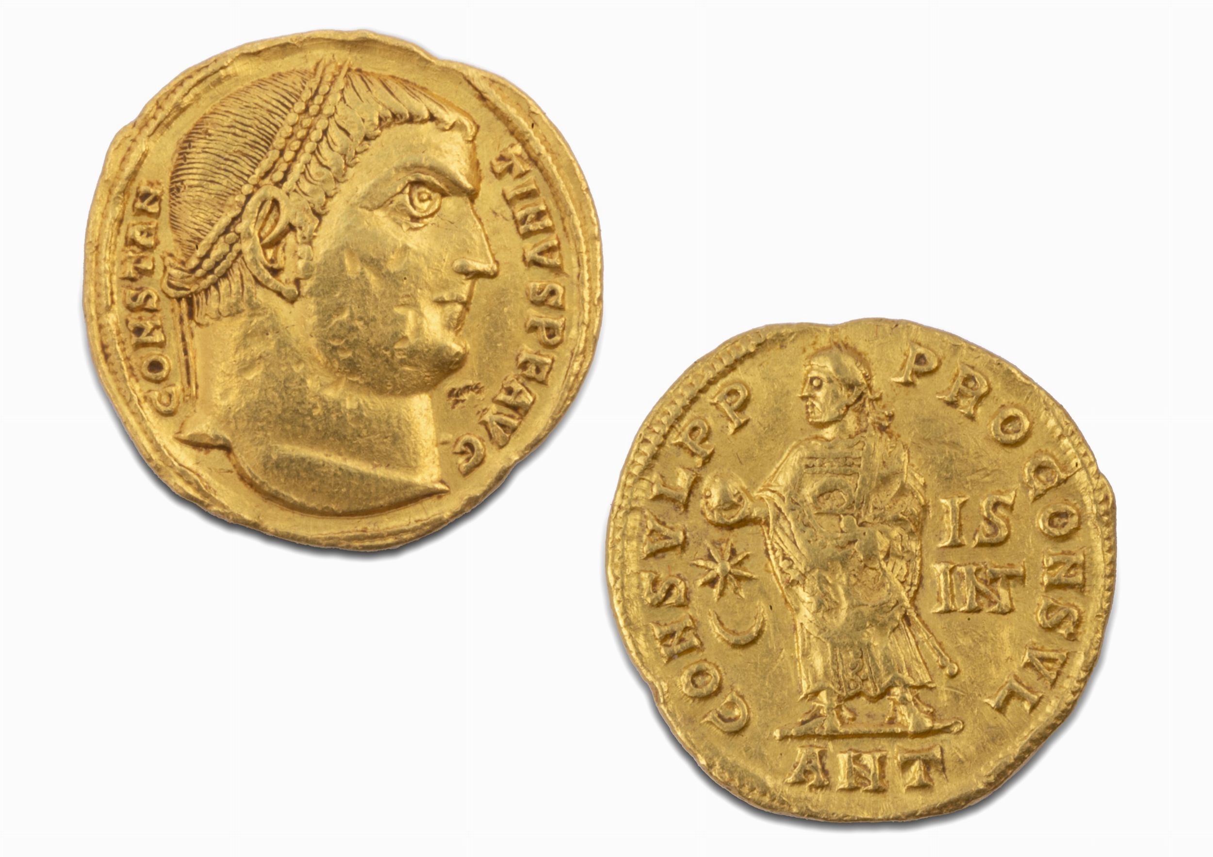 317-319 d.C., D/ CONSTANTINVS P F AVG, Testa diademata a d., R/ CONSVL P P PROCONSVL, IS NT, ANT, Zecca di Antiochia, Rif. bibl. R.I.C. 22; Metallo: AV, gr. 5,28, Diam.: