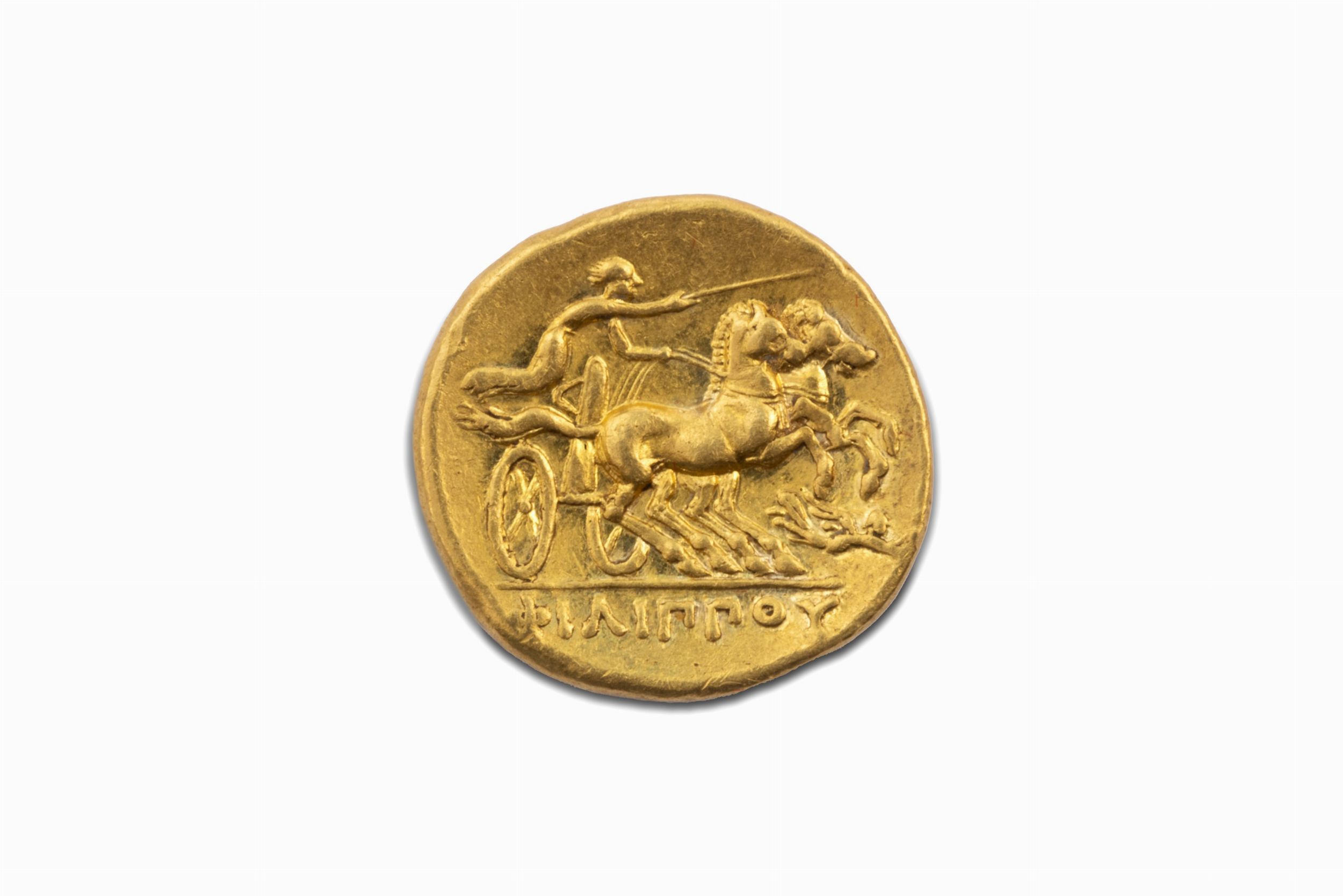 340-328 a.C., D/ testa laureata di Apollo a d., R/ auriga su biga a d., tiene il frustino con la destra e le redini con la sinistra. Sotto le zampe dei cavalli una Nike in volo a d. con corona, Zecca di Pella, Rif. bibl. Le Rider 357; Metallo: AV, gr. 8,56, diam. 18,52 mm., qSPL