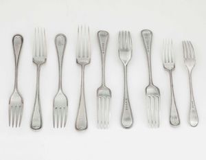 Insieme di nove forchette. Londra, fine XIX secolo, argentieri differenti