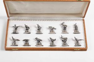 12 segnaposti a soggetto Venatorio in metallo argentato, con scatola