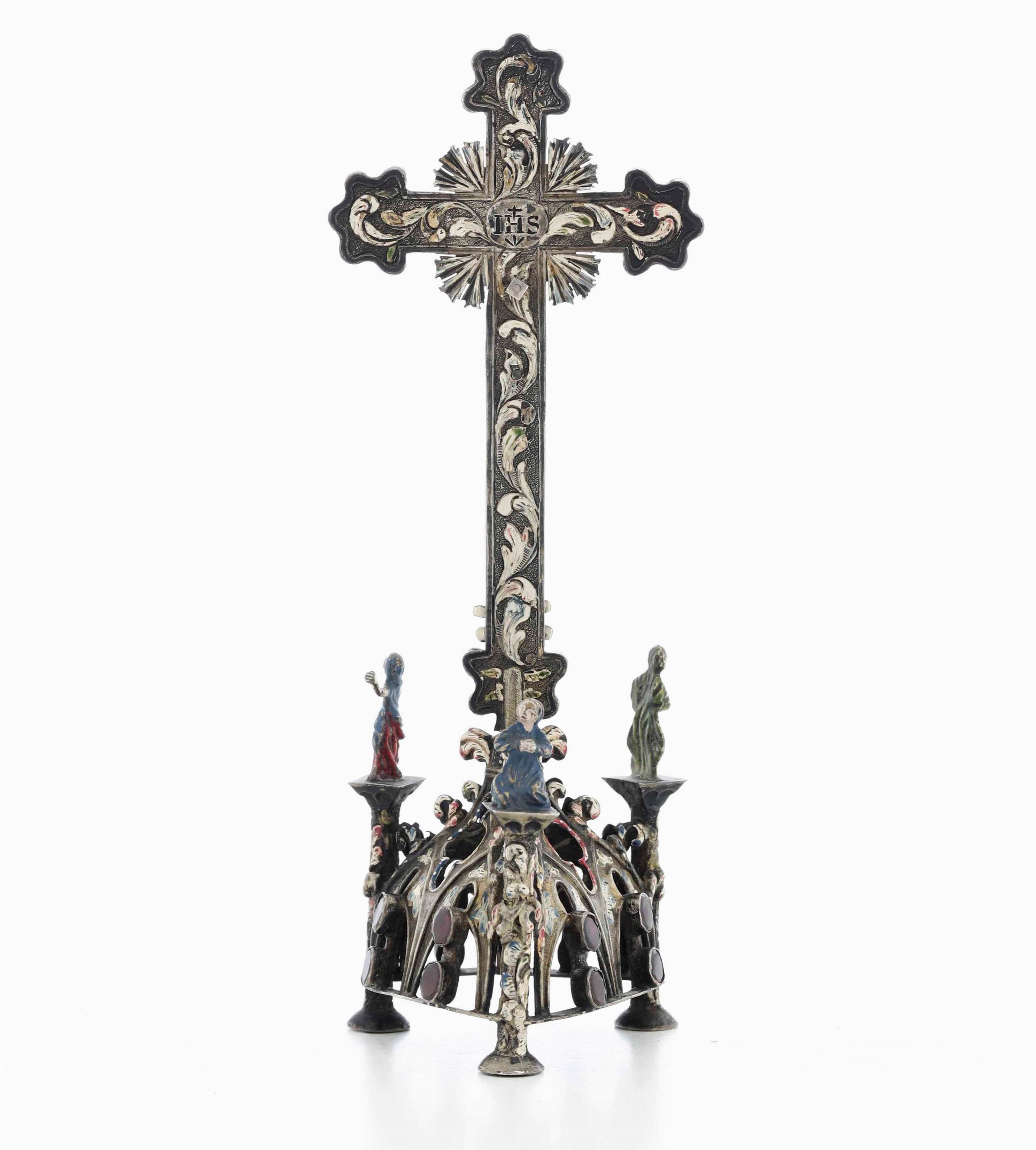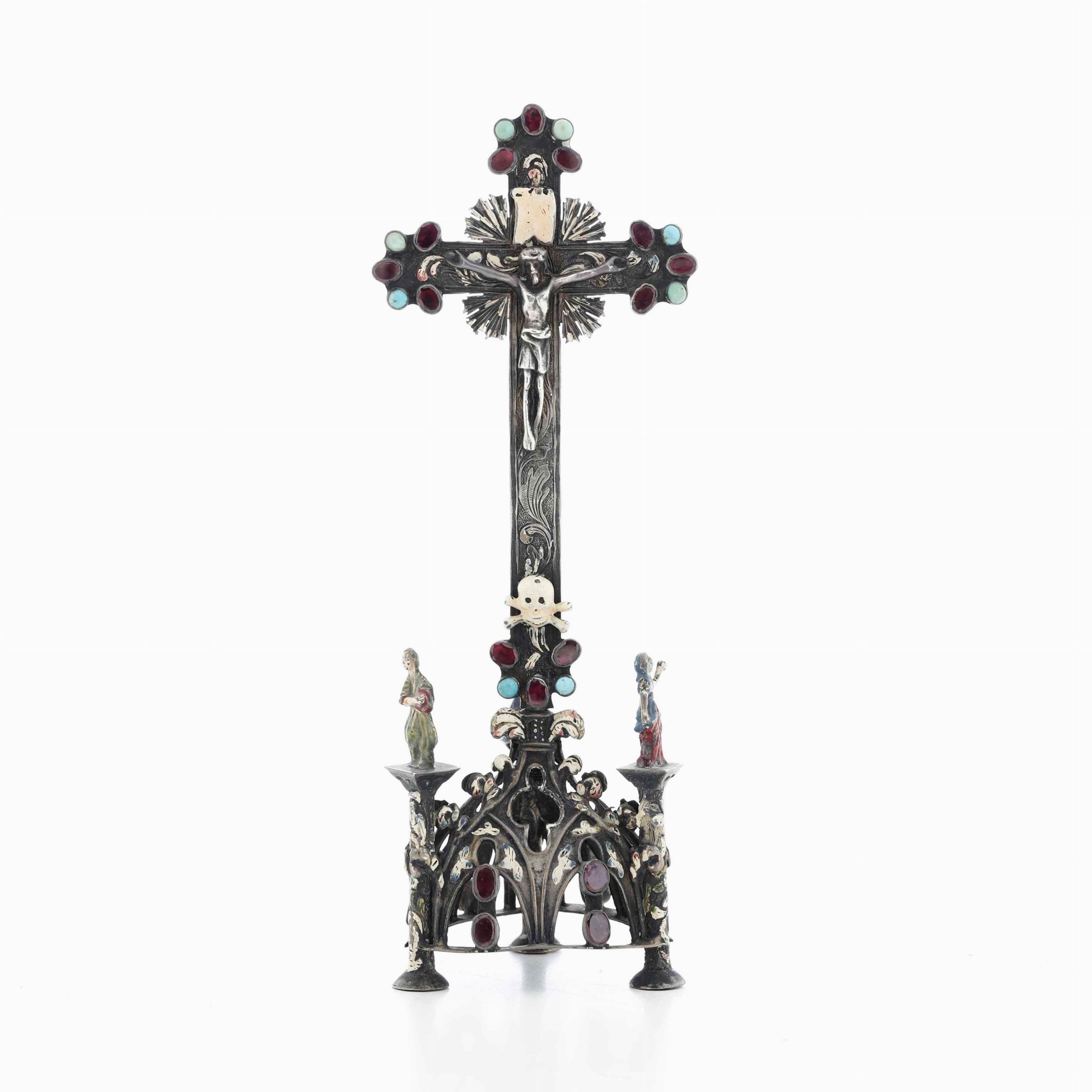 Crocifisso da meditazione. Argento fuso, traforato, cesellato e smaltato. Castoni [..]