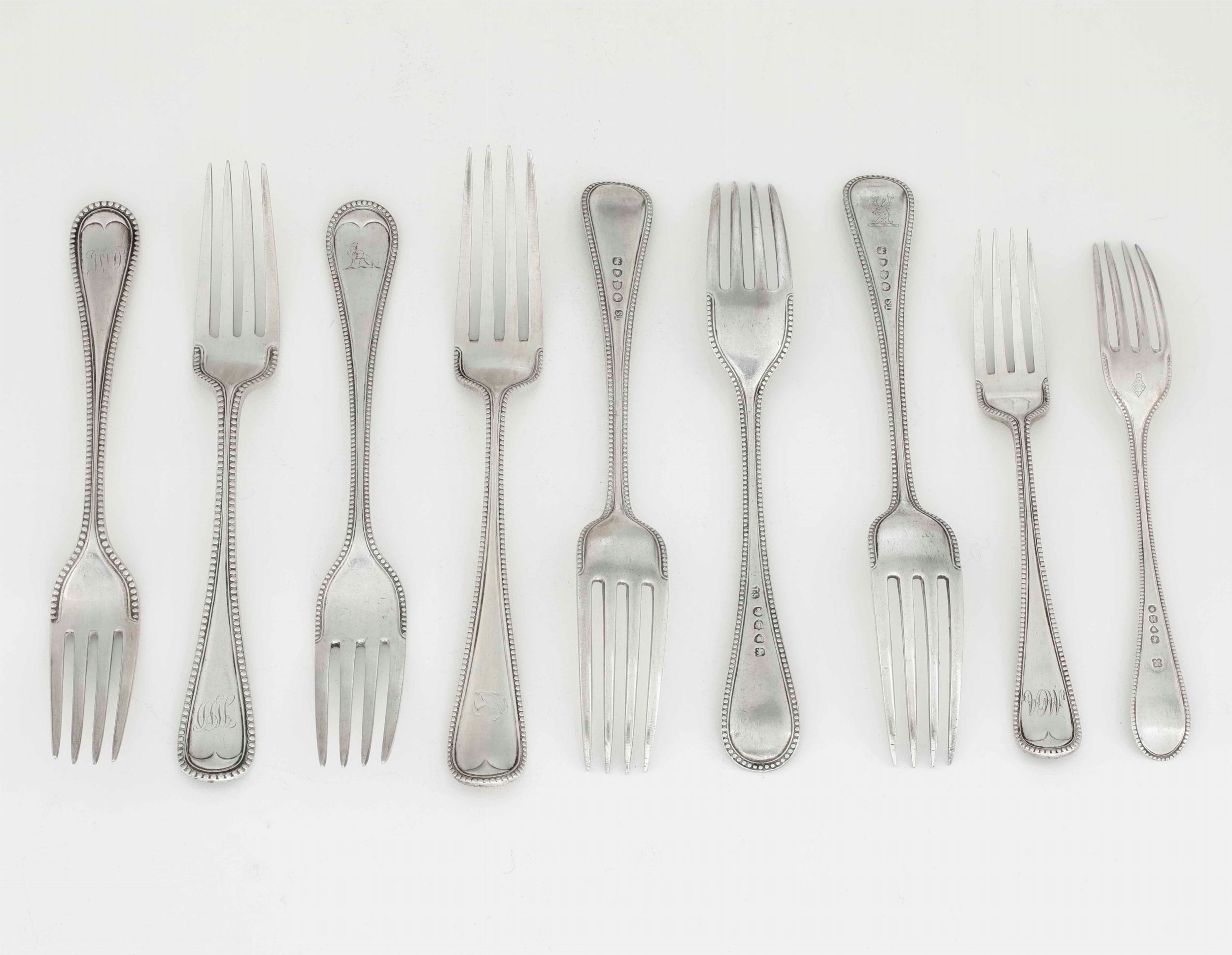 Insieme di nove forchette. Londra, fine XIX secolo, argentieri differenti