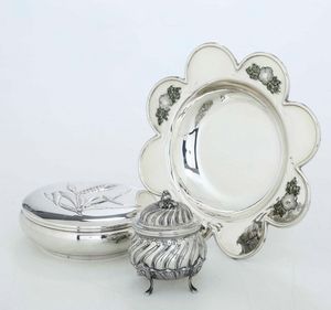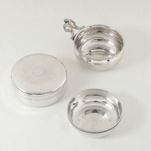 Lotto in argento composto da un coppetta, un tastevin e una scatoletta. Argenteria [..]