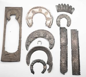 Lotto di varie rize ed elementi in metallo e argento sbalzato