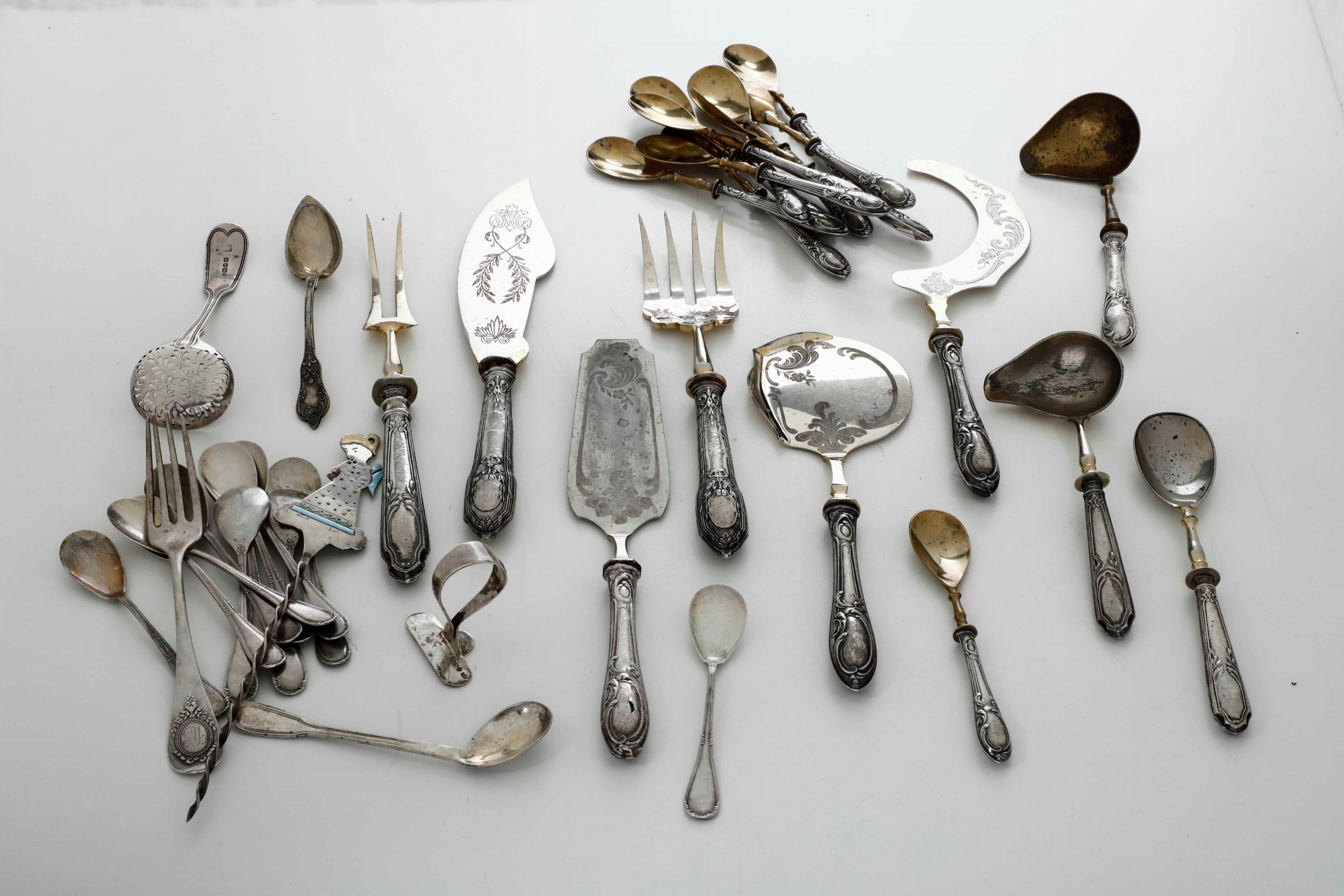 Lotto comprendente 11 cucchiaini da dolce, 9 posate da portata parzialmente dorate, [..]
