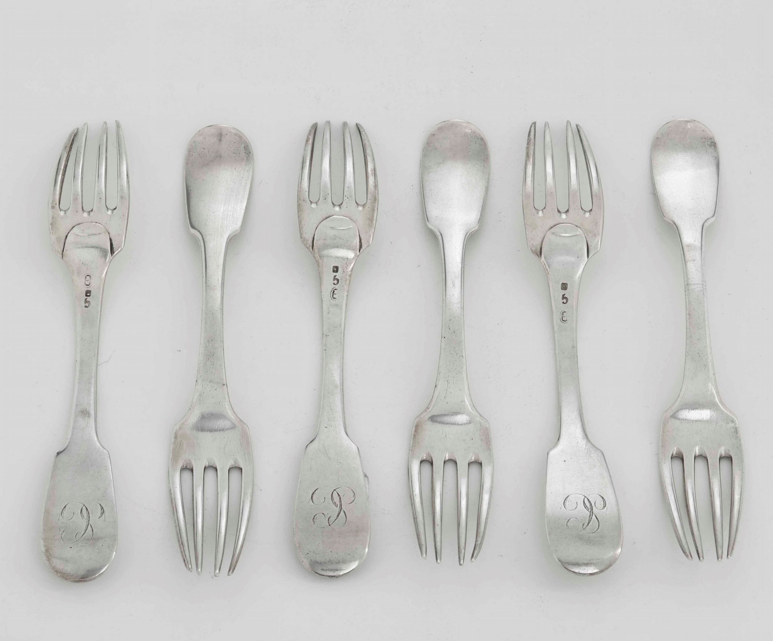 Sei forchette. Napoli, 1809-1824. Marchio dell'argentiere RM entro ovale perlinato [..]
