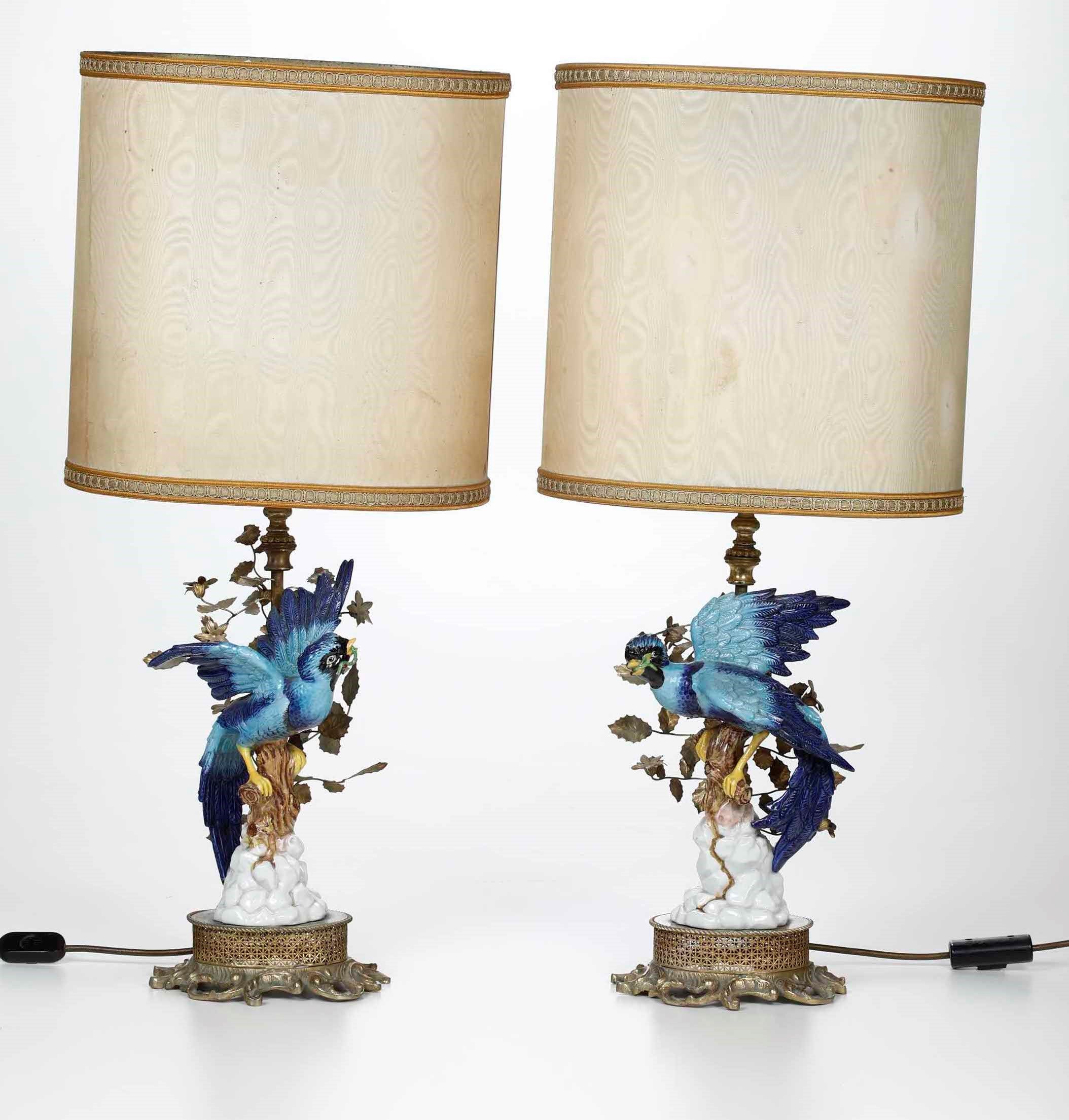 Coppia di figure di uccelli del paradiso montati a lampada