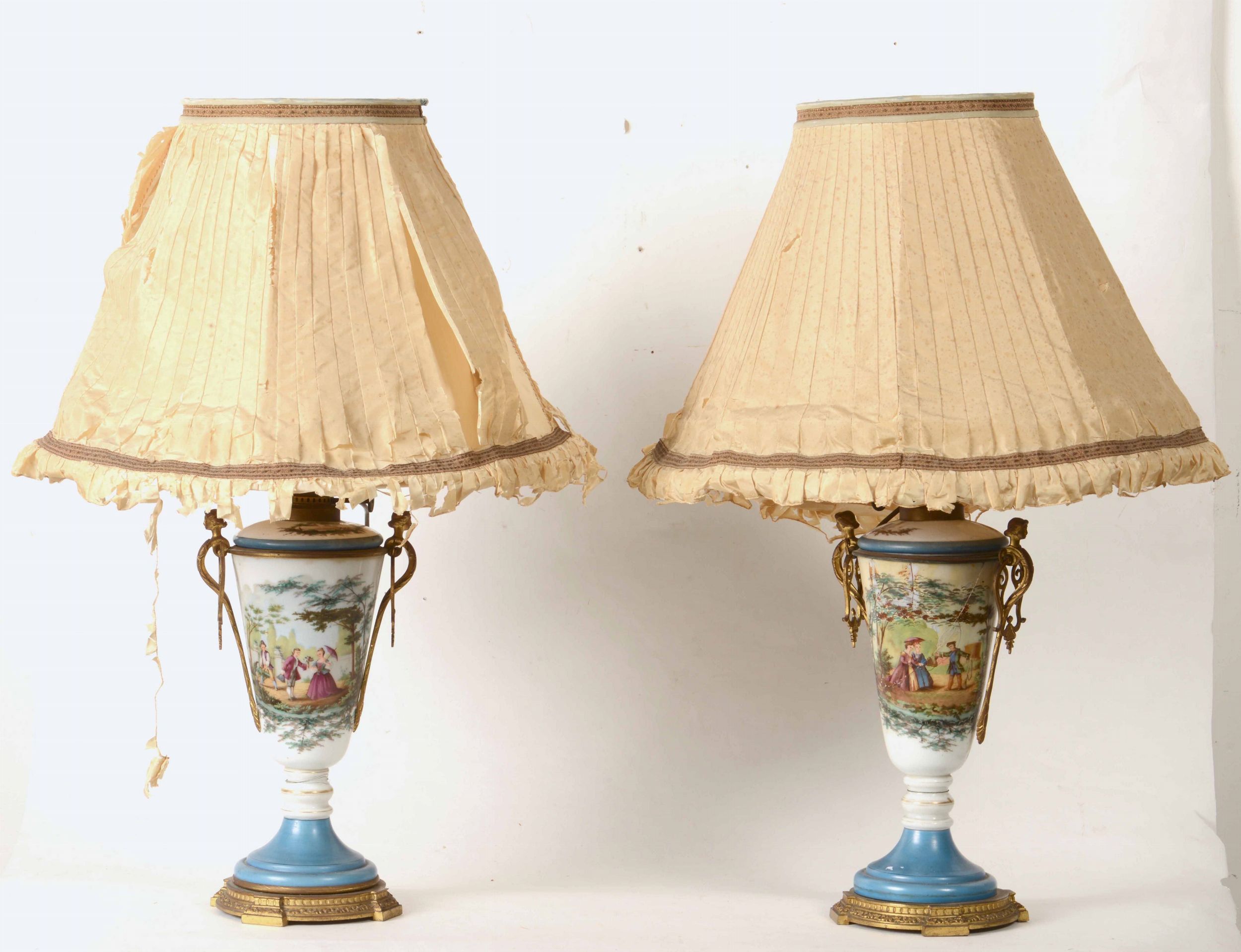 Coppia di lampade a petrolio in ceramica dipinta con scene galanti e anse in metallo [..]