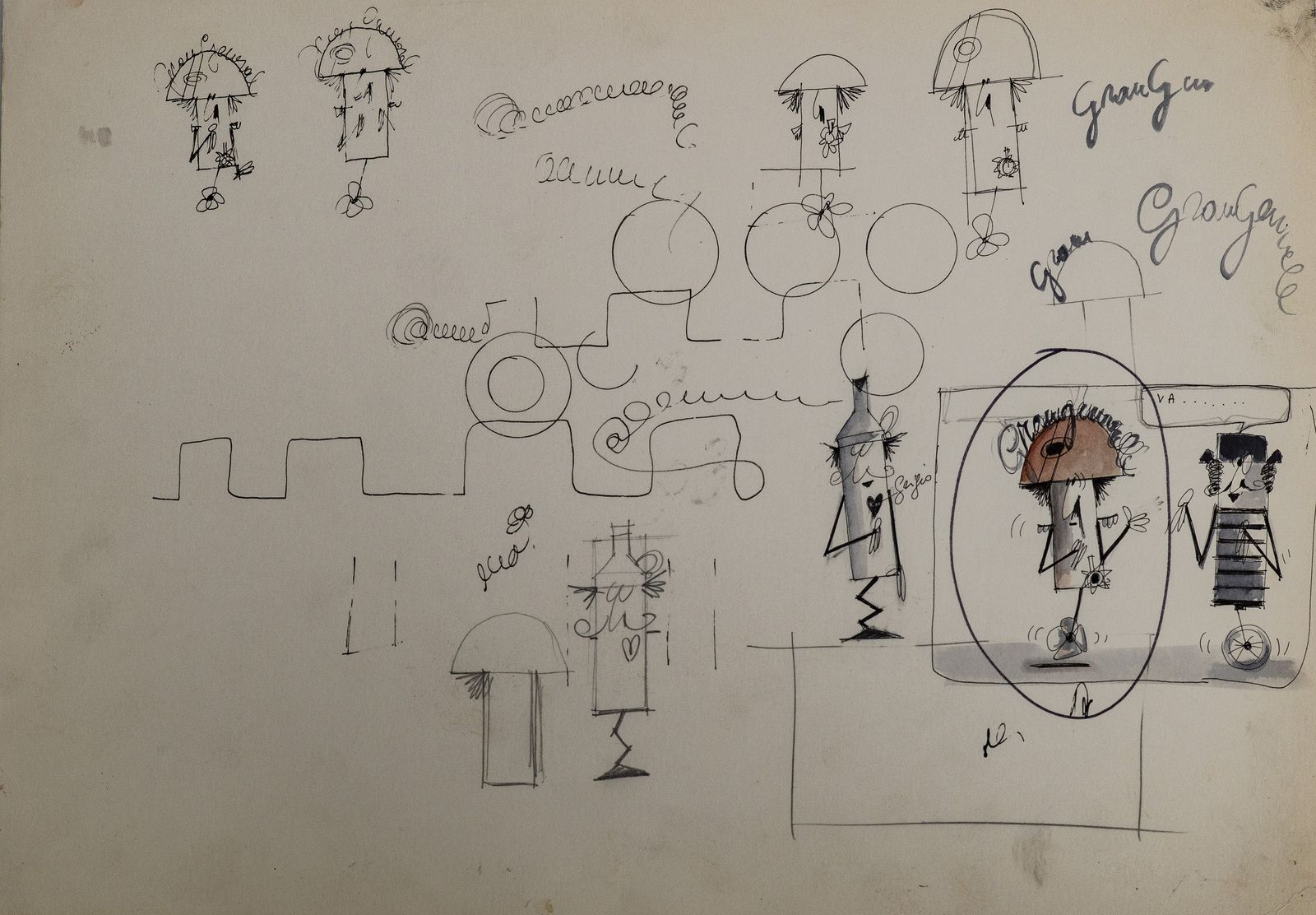 Disegno fronte e retro. Il lotto proviene dagli archivi dei collaboratori della Lodolo Film, storica società di spot pubblicitari e di animazione italiana nata verso le fine degli anni 50. I Posteros, personaggi di fantasia, primitivi del futuro, nascono dalla collaborazione di Pino Pascali con la Lodolo film nel1958, un anno prima del suo diploma all’Accademia di Belle Arti di Roma. sodalizio che durò sino al 1967. Sandro Lodolo, titolare della casa di produzione pubblicitaria, e Pino Pascali, nel ruolo di creativo, realizzarono innumerevoli spot e cartoons pubblicitari. Gli Intermezzi che videro proprio i Posteros come protagonisti furono eseguiti , sia in bianco e nero che a colori, nel 1962 e nel 1968, anno della morte di Pascali, quando vennero ripresi da Lodolo come studio per i personaggi di un nuovo contenitore pubblicitario del secondo programma della Rai.