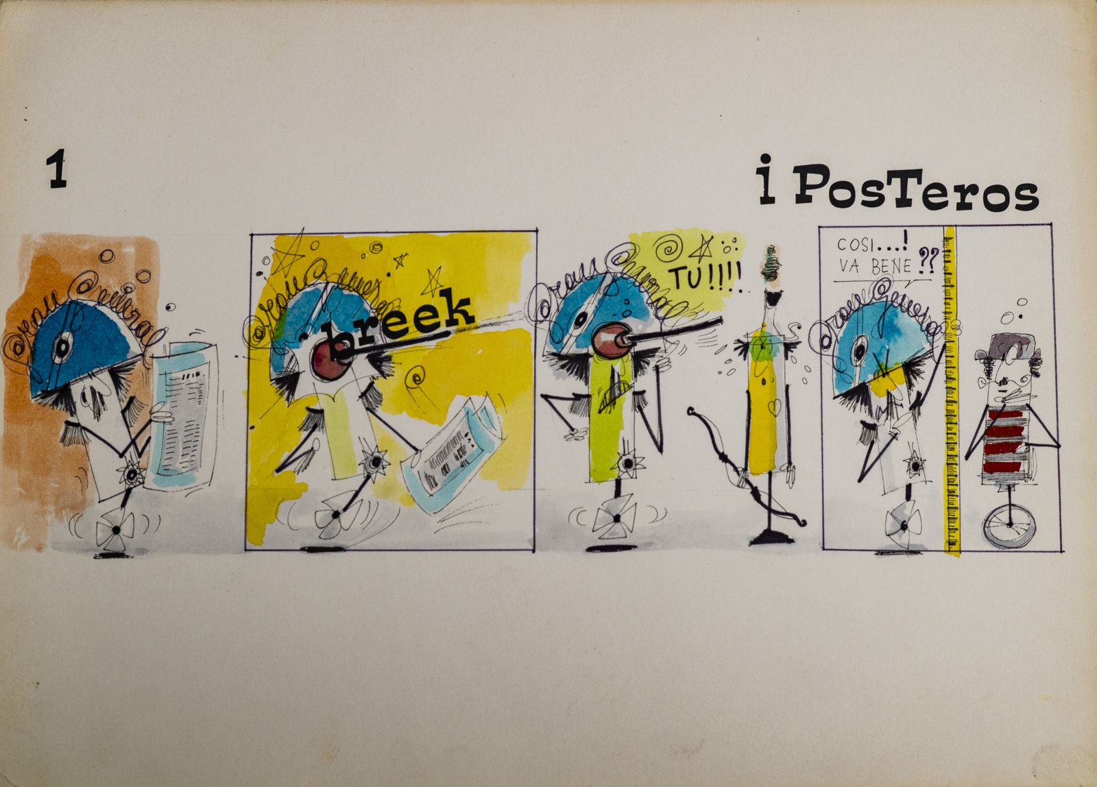 Il lotto proviene dagli archivi dei collaboratori della Lodolo Film, storica società di spot pubblicitari e di animazione italiana nata verso le fine degli anni 50. I Posteros, personaggi di fantasia, primitivi del futuro, nascono dalla collaborazione di Pino Pascali con la Lodolo film nel1958, un anno prima del suo diploma all’Accademia di Belle Arti di Roma. sodalizio che durò sino al 1967. Sandro Lodolo, titolare della casa di produzione pubblicitaria, e Pino Pascali, nel ruolo di creativo, realizzarono innumerevoli spot e cartoons pubblicitari. Gli Intermezzi che videro proprio i Posteros come protagonisti furono eseguiti , sia in bianco e nero che a colori, nel 1962 e nel 1968, anno della morte di Pascali, quando vennero ripresi da Lodolo come studio per i personaggi di un nuovo contenitore pubblicitario del secondo programma della Rai.