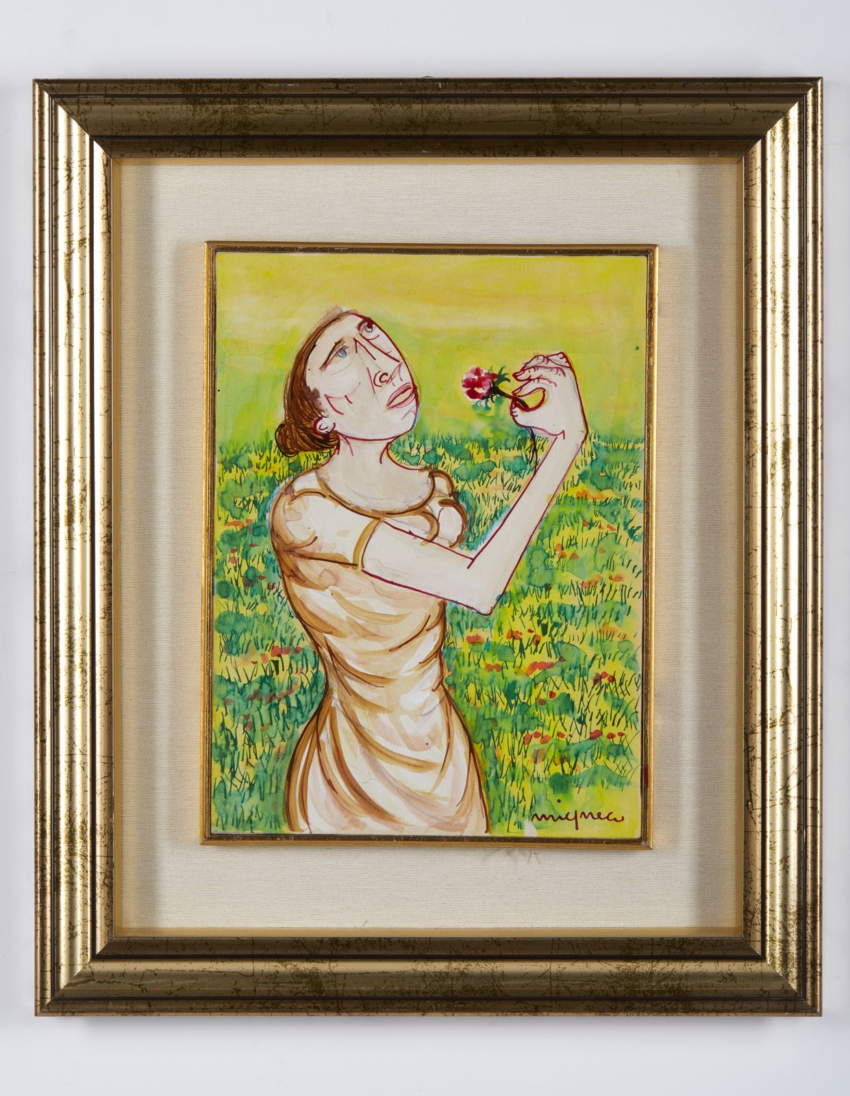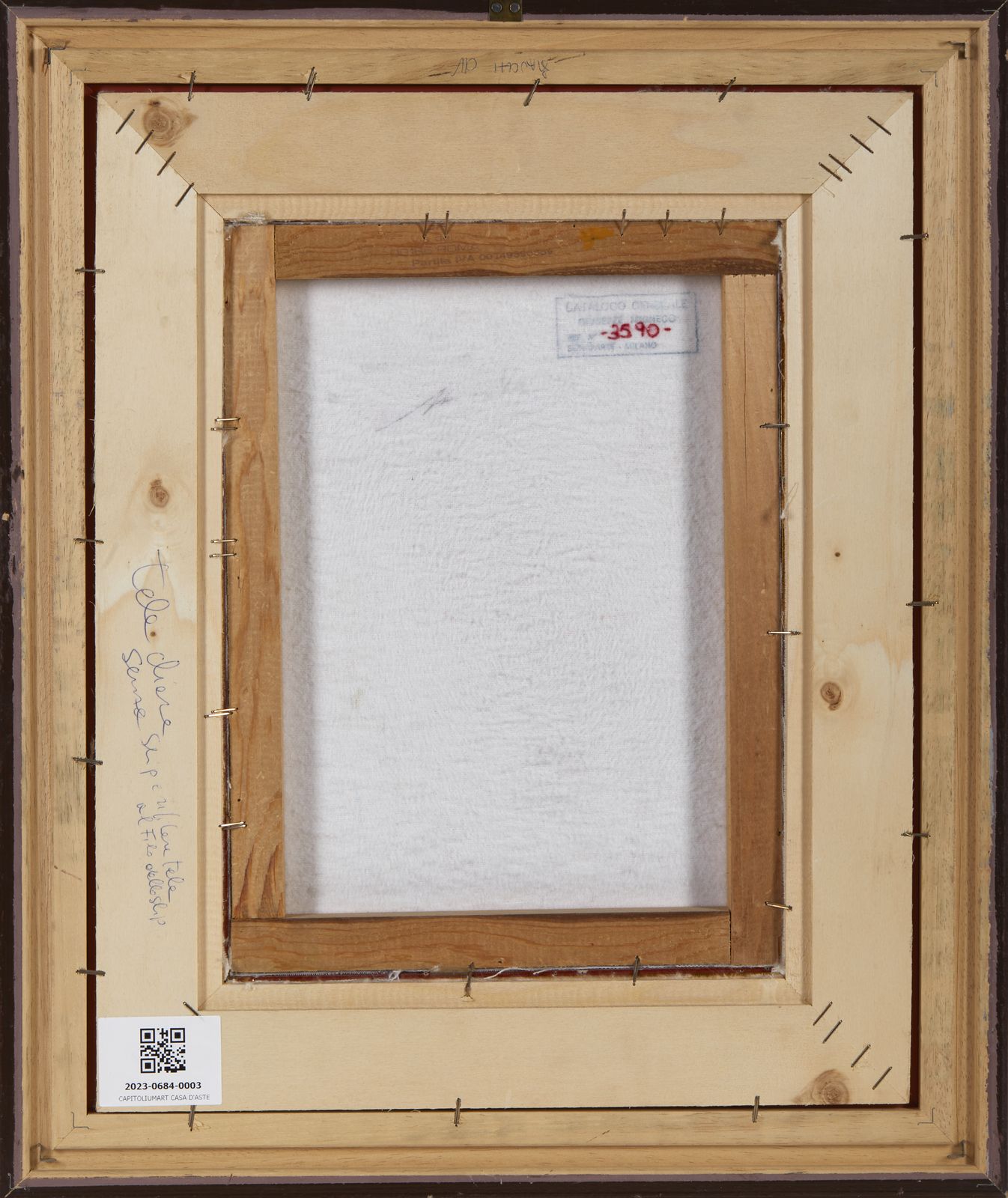 Firma in basso a destra. Al retro timbro Galleria Bonaparte, Milano. Opera archiviata presso la Galleria Bonaparte, Milano, come da documentazione fotografica allegata all'opera riportante il relativo numero d'inventario, la firma dell'artista e il timbro Galleria Lisi, Roma. Provenienza: Galleria Lisi, Roma. Collezione privata, Roma. Lievi difetti.