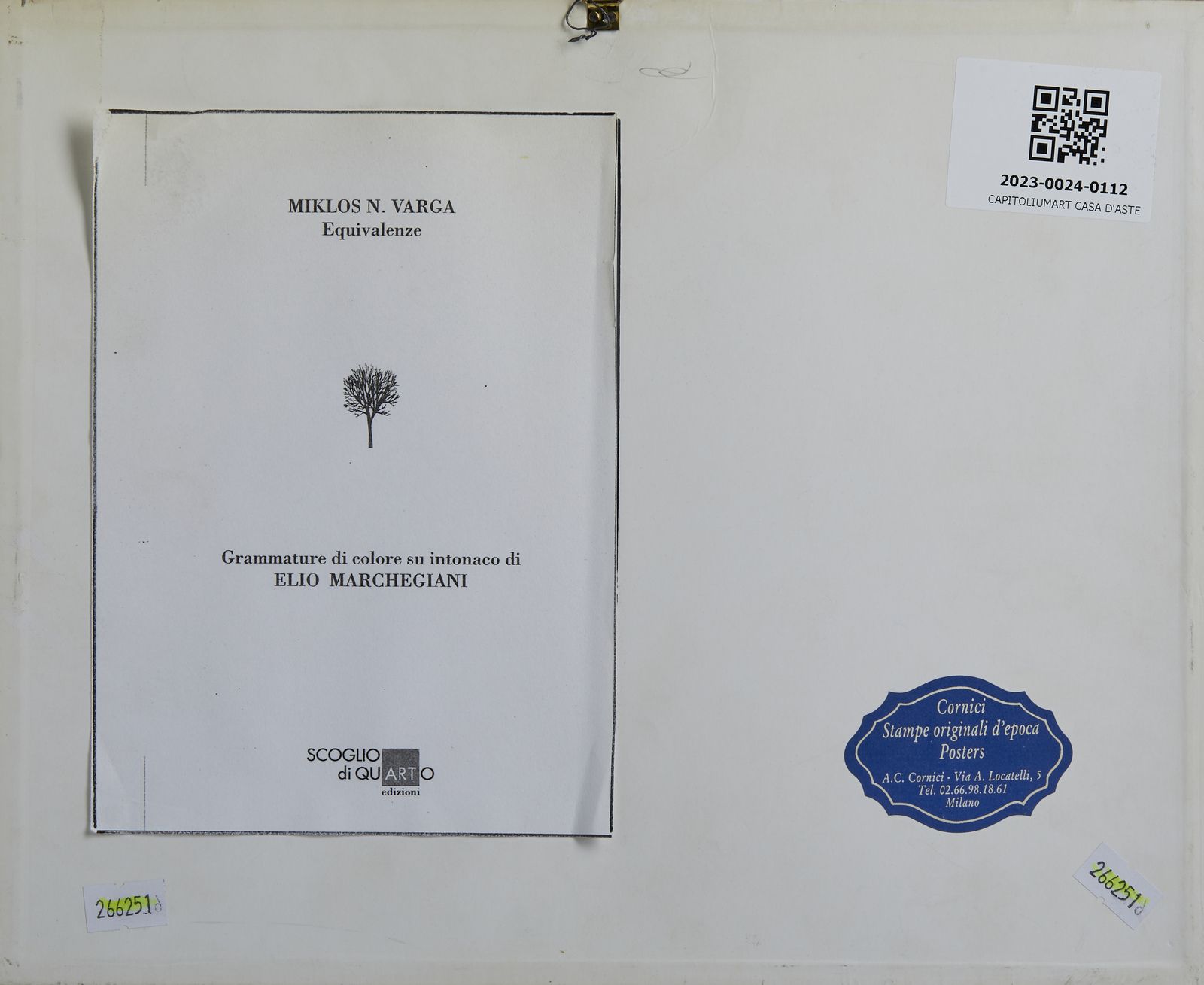 Al retro titolo e firma. Certificato di autenticità rilasciato da Contearte, Milano, come da documentazione fotografica allegata all'opera. Pubblicazioni: Equivalenze. Grammature di colore su intonaco di Elio Marchegiani, a cura di Miklos N. Varga, Scoglio di Quarto edizioni, Milano.