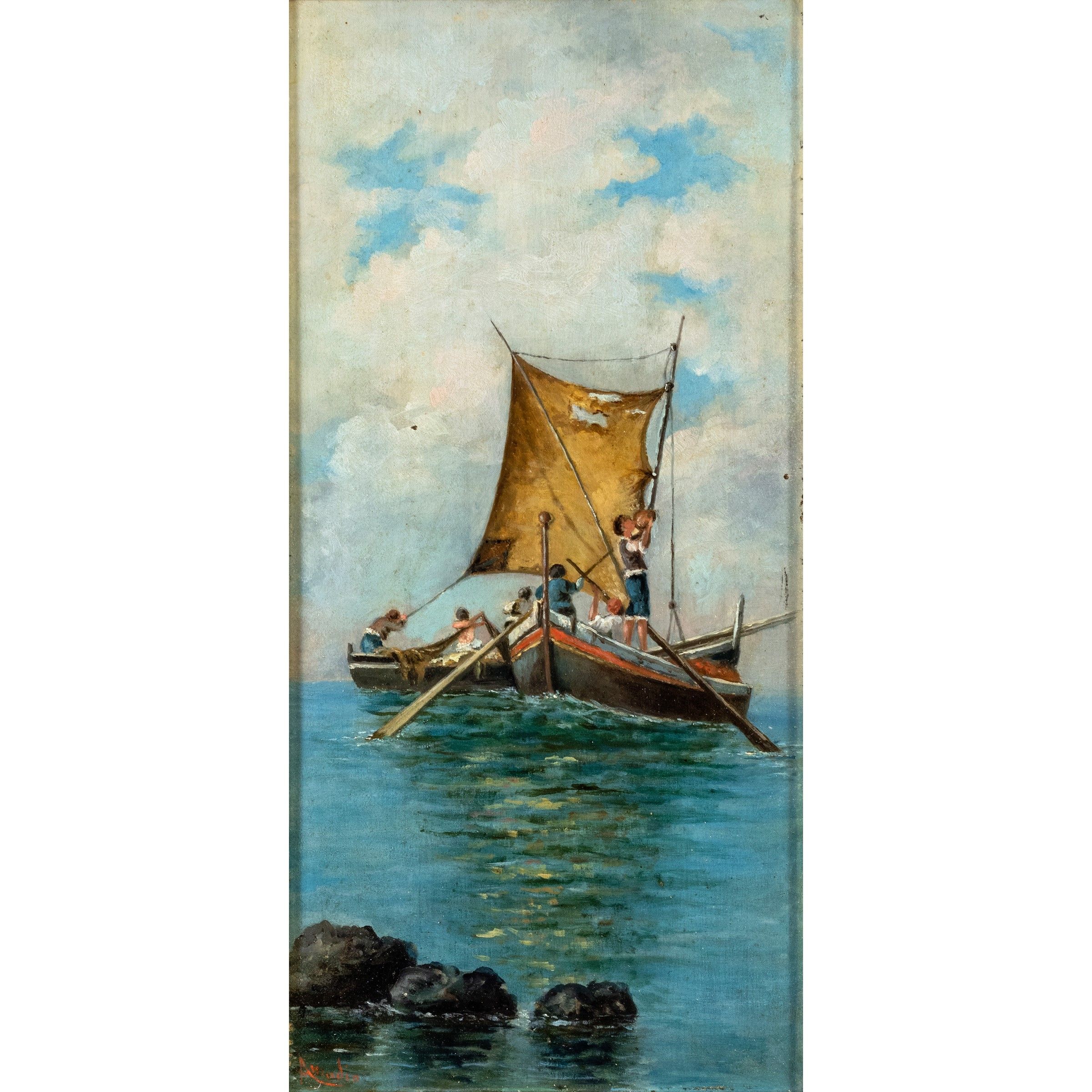 Italia, XX Sec. Marina con pescatori, olio su tavola, firmato in basso a sinistra