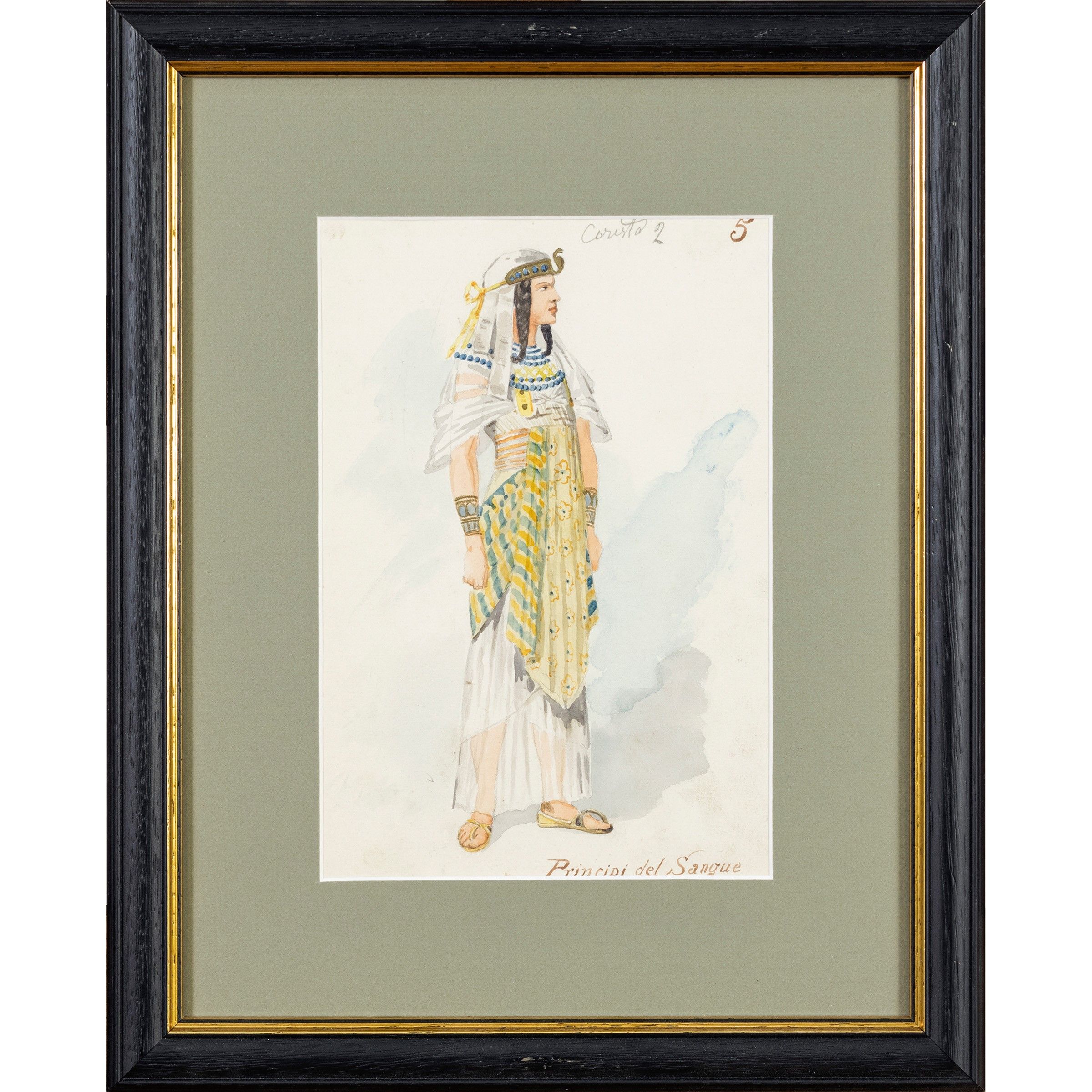 Italia, 1904 circa figurino per la rappresentazione dell'opera Aida di Giuseppe Verdi, tecnica mista su carta, entro cornice