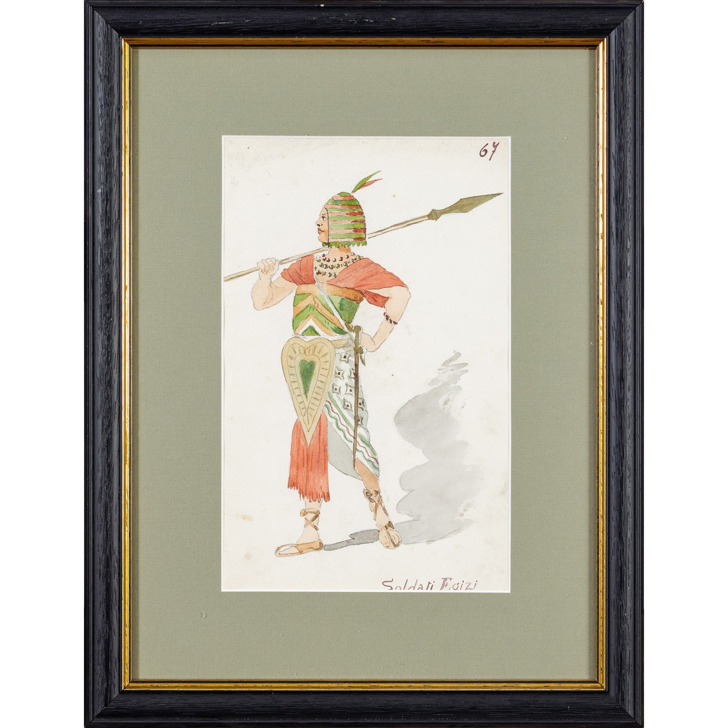 Italia, 1904 circa figurino per la rappresentazione dell'opera Aida di Giuseppe Verdi, tecnica mista su carta, entro cornice