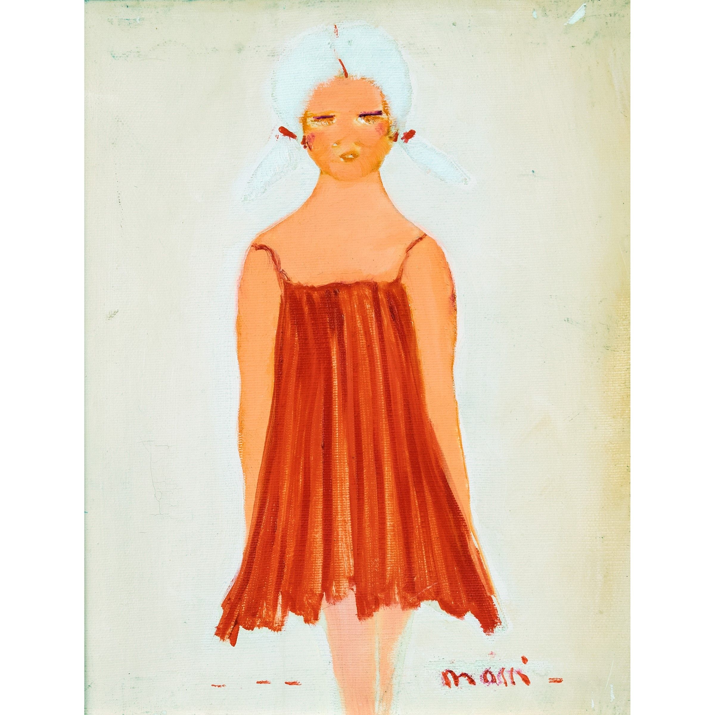 Castiglione Casauria 1938 - Roma 2008 Figura di bambina con abito rosso, olio su tela, firmato in basso a destra e sul retro