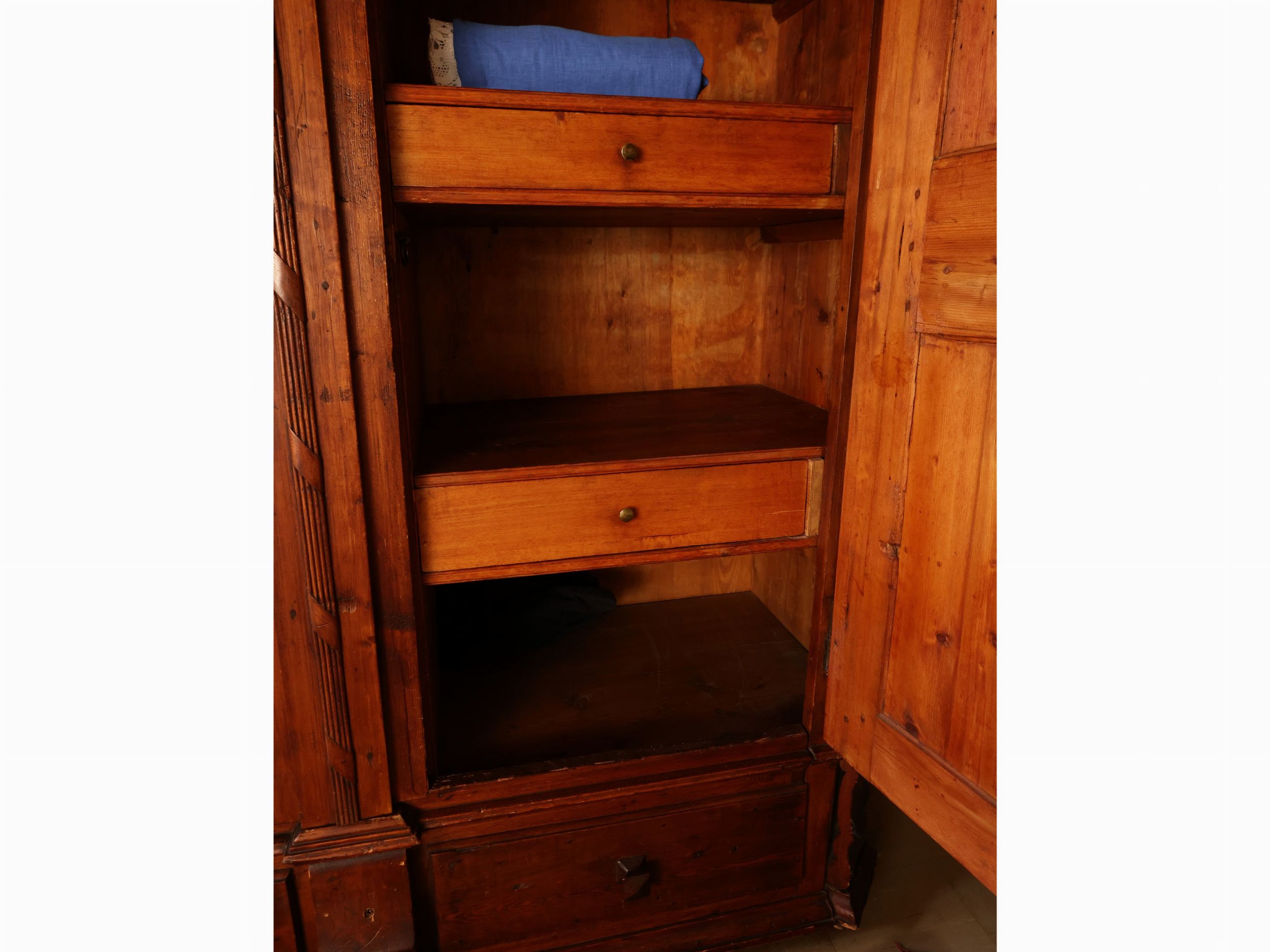 prima metà del XIX secolo cappello modanato e intagliato con motivo di festone con nappine, due sportelli sul fronte tra lesene scantonate a colonna, un cassetto alla base, interno organizzato con ripiani e cassetti