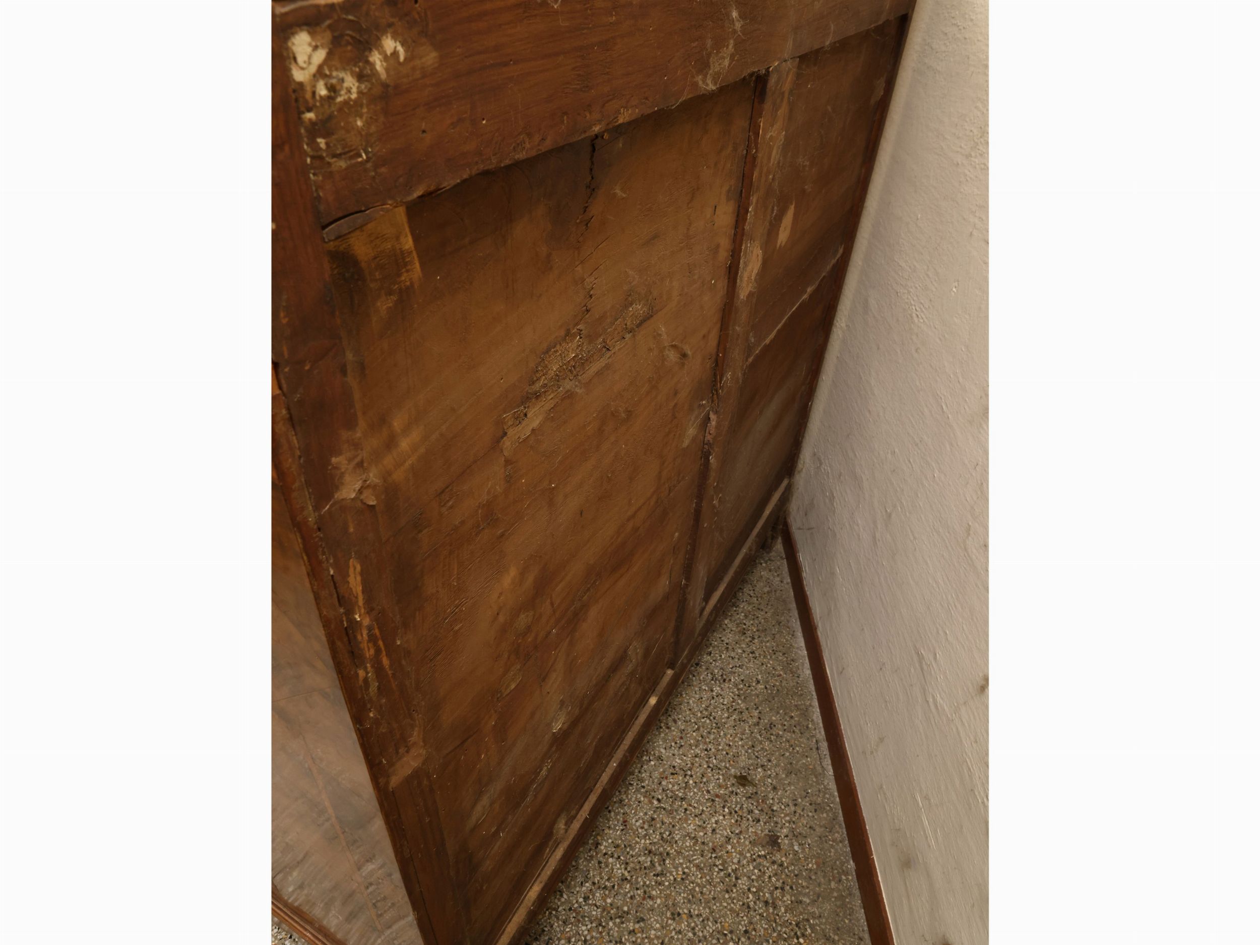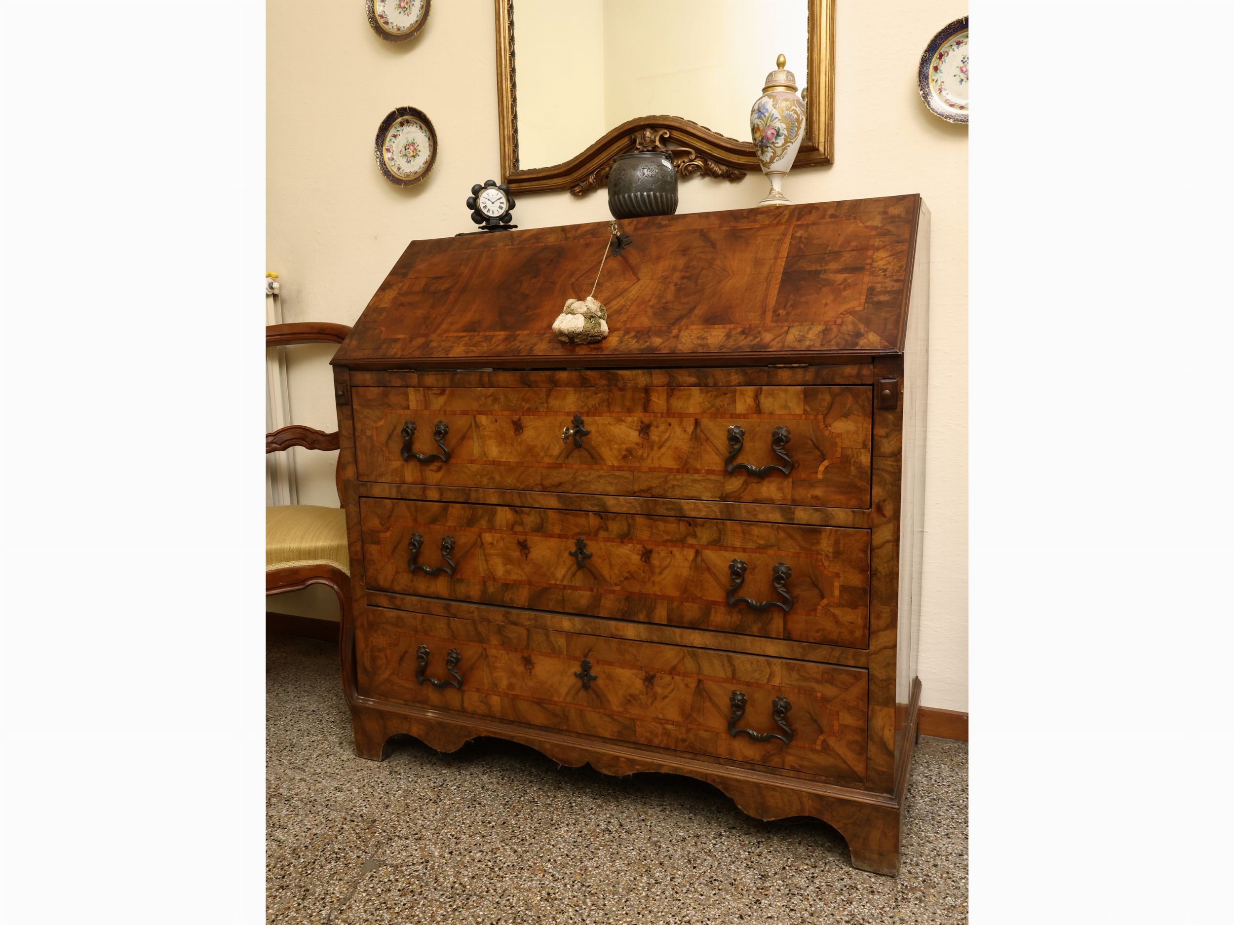 Cassettone a ribalta impiallacciato in radica di noce e di olivo