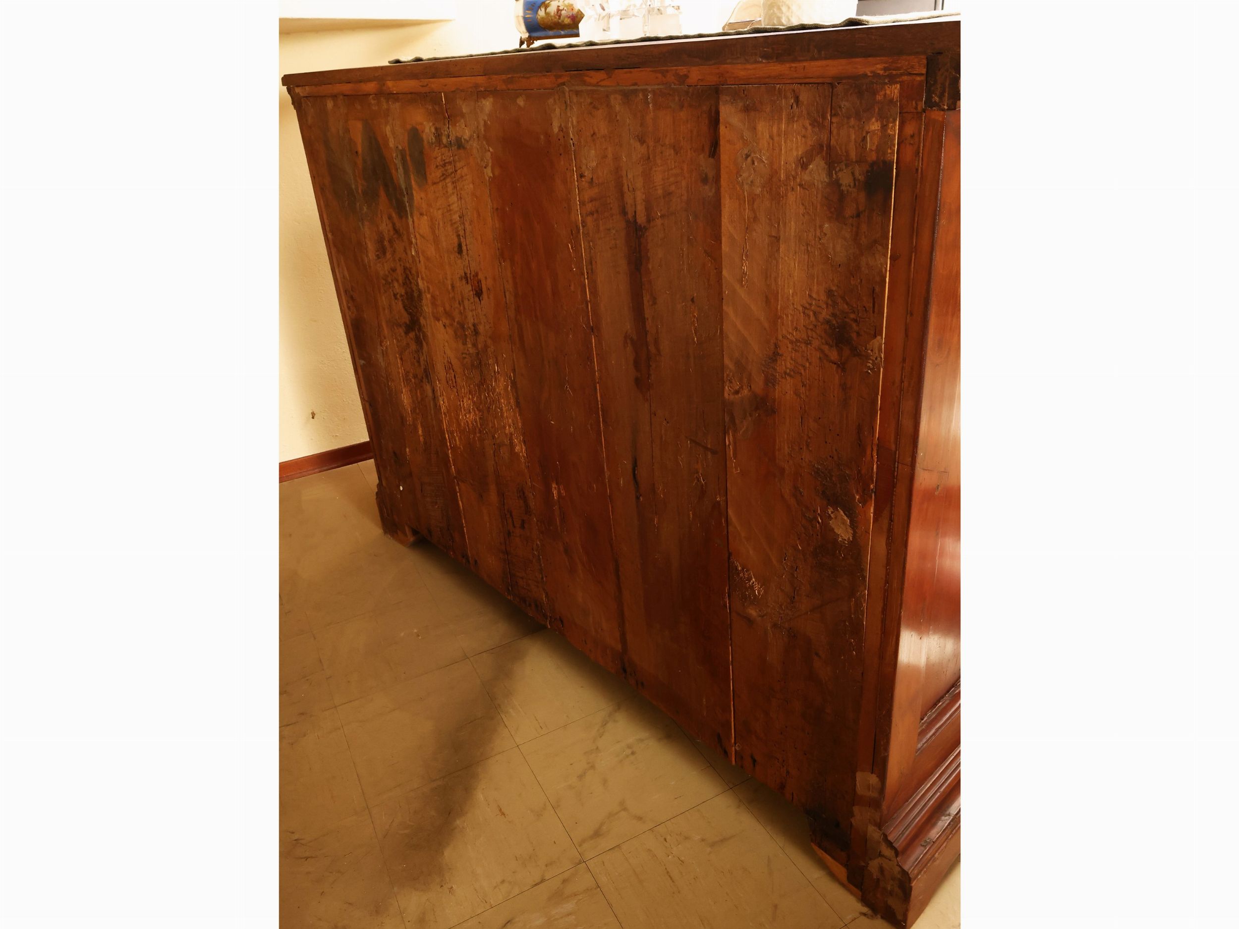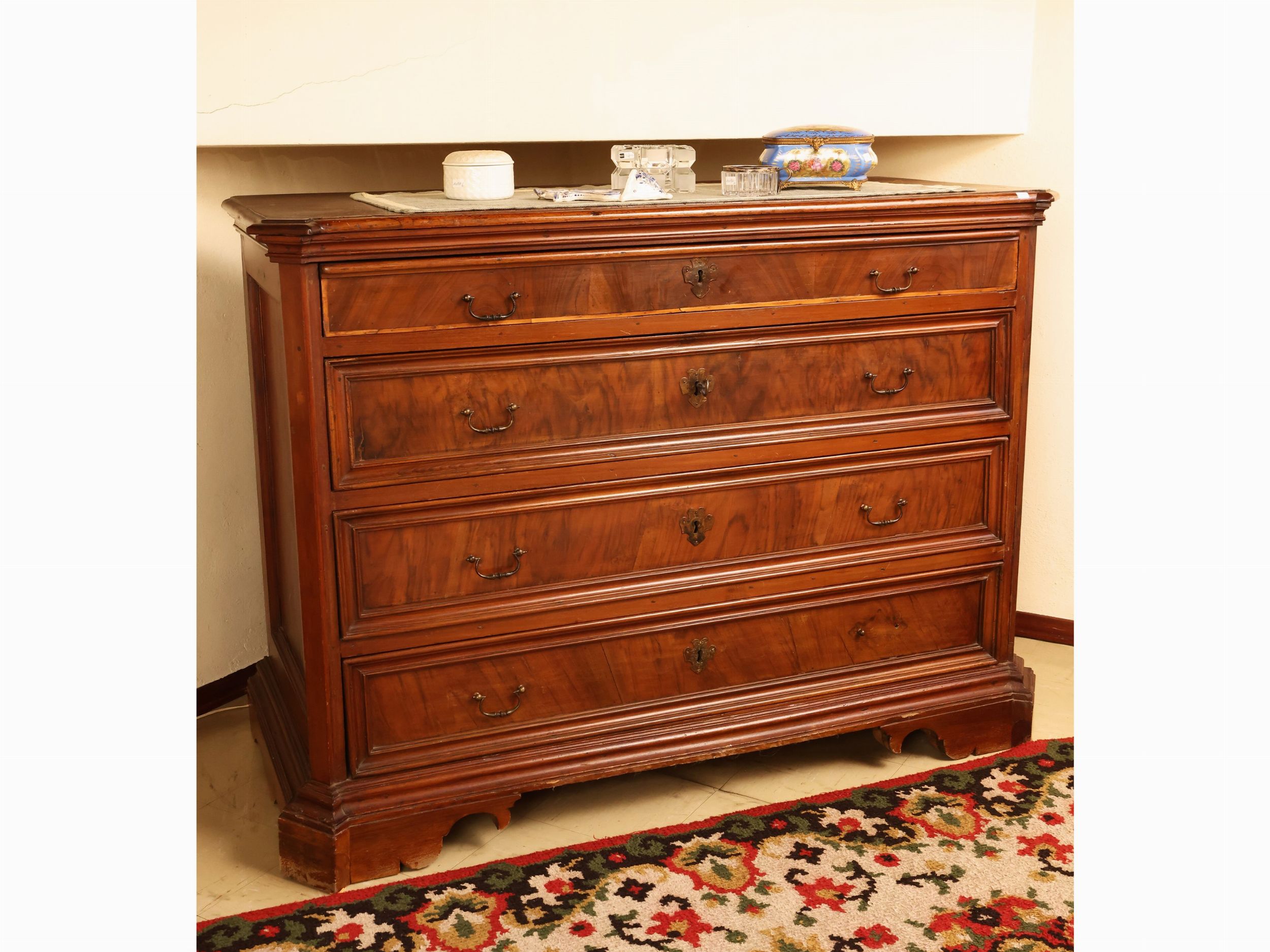 XVII secolo piano sagomato con bordo a becco di civetta, quattro cassetti sul fronte con bordi modanati, fianchi scantonati, piedi a mensola, alcuni restauri