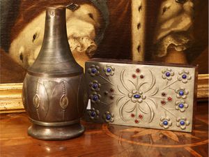 fiasca h cm 26, scatola h cm 6x23x13 (2) inizio del XX secolo una fiasca olandese in metallo sbalzato e una scatola [..]