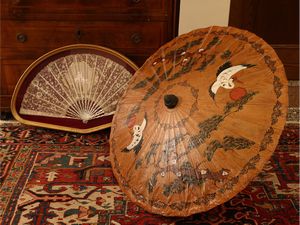 lungh cm 60, cm 50x70 (2) un ombrellino orientale in bambù con tesa in carta dipinta ed un ventaglio da [..]