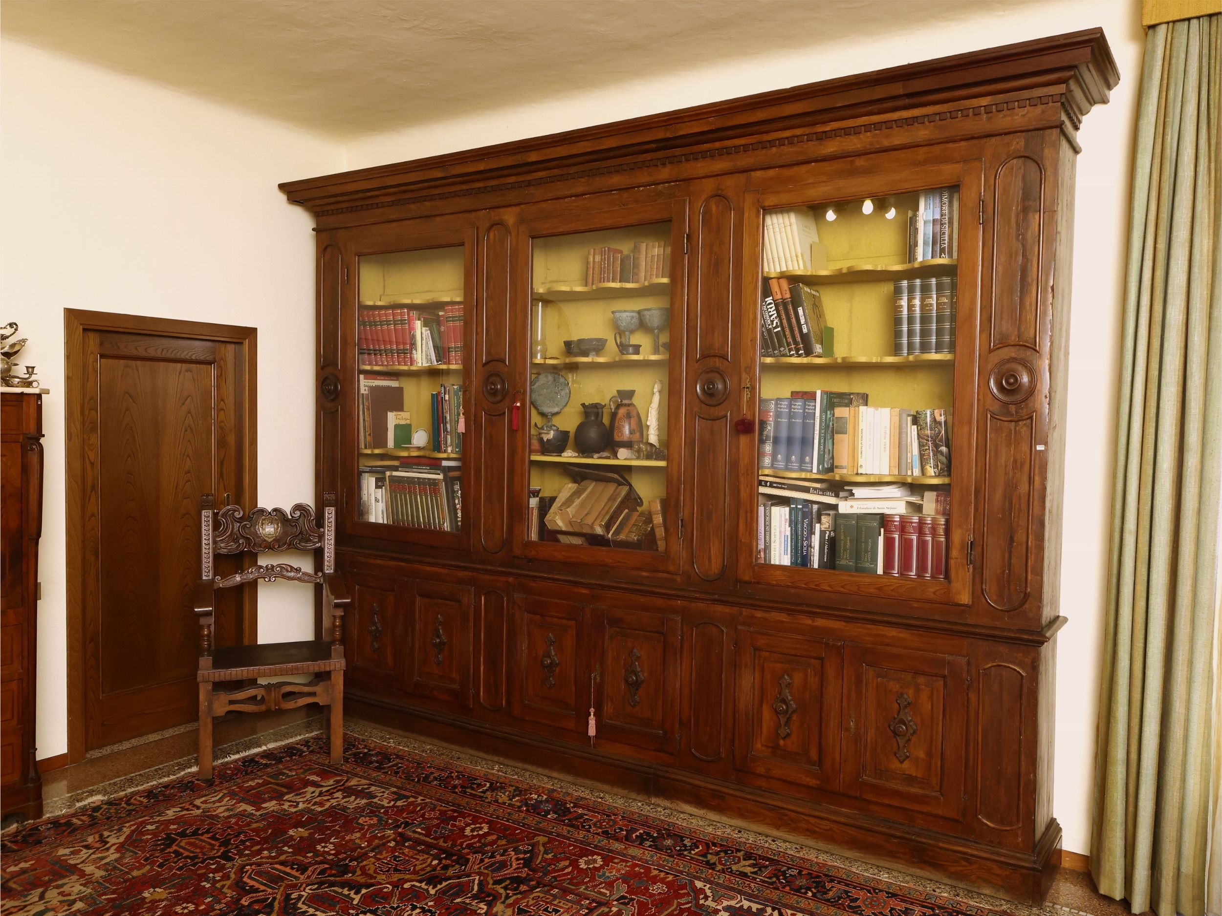 h cm 270x380x50 XIX secolo ricavata da un mobile da farmacia di dimensioni più ampie, cappello aggettante con gocciolatoio, tre sportelli a vetro scanditi da quattro lesene con cornici ovoidali centrate da borchie circolari, sei sportelli sottostanti decorati da formelle sagomate, base a cornice, alcuni restauri