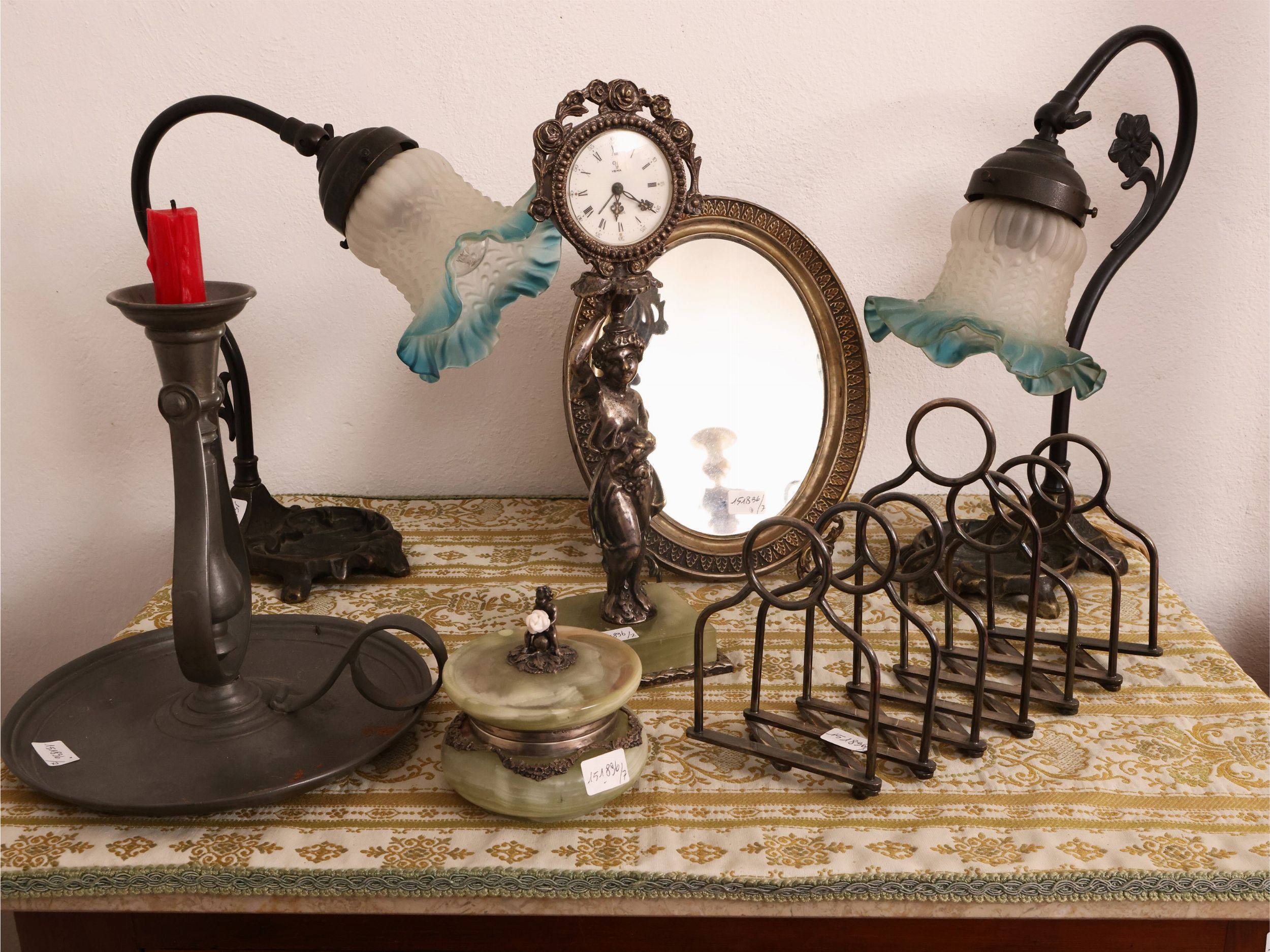 da h cm 9 a h cm 32 (7) tra cui una coppia di lumi da tavolo in metallo e bobeche in vetro, una scatola in onice rilegata in argento, orologio da tavolo in metallo argentato e onice, una specchiera da tavolo ovale decorata a palmette in metallo argentato, difetti