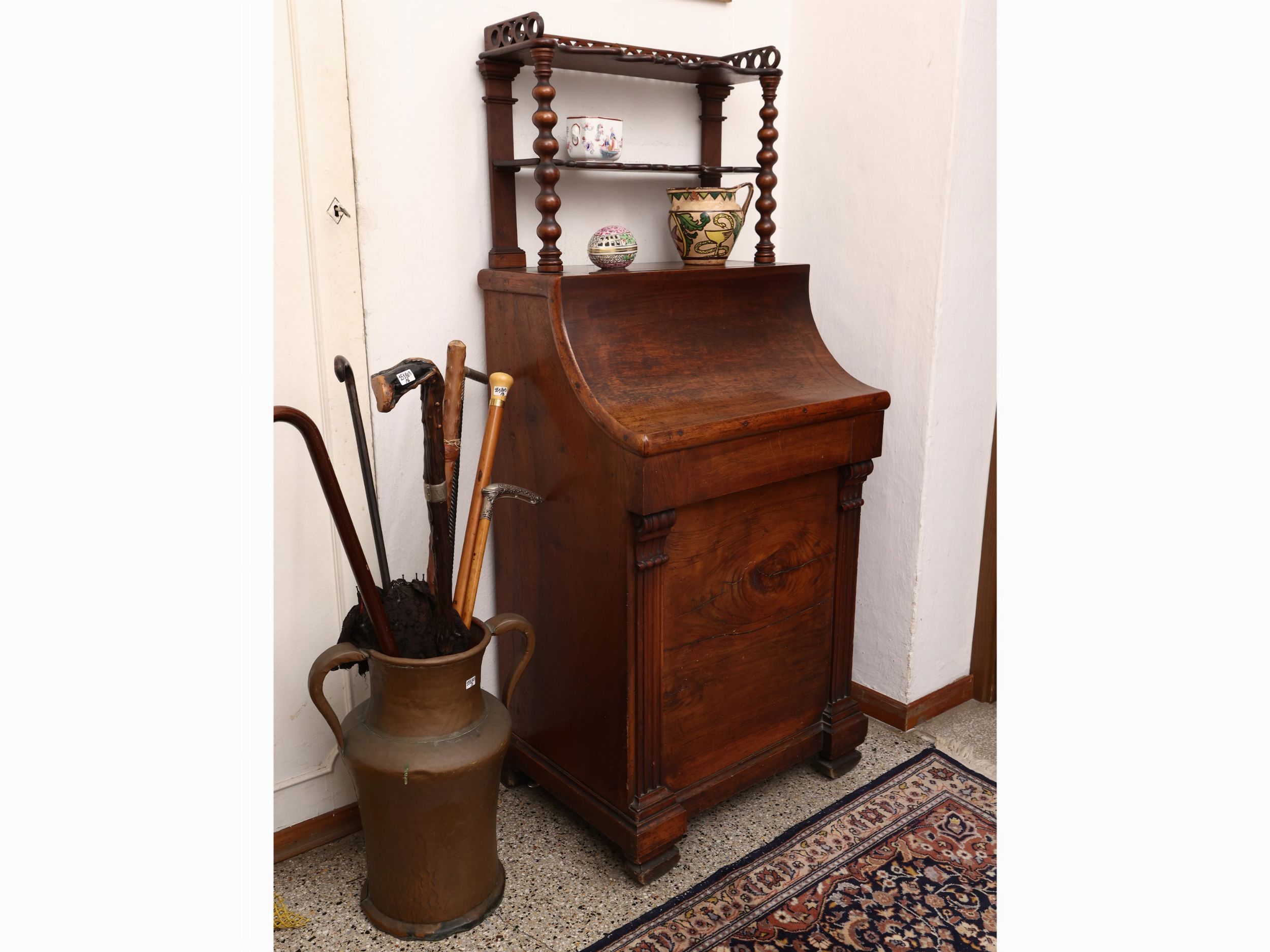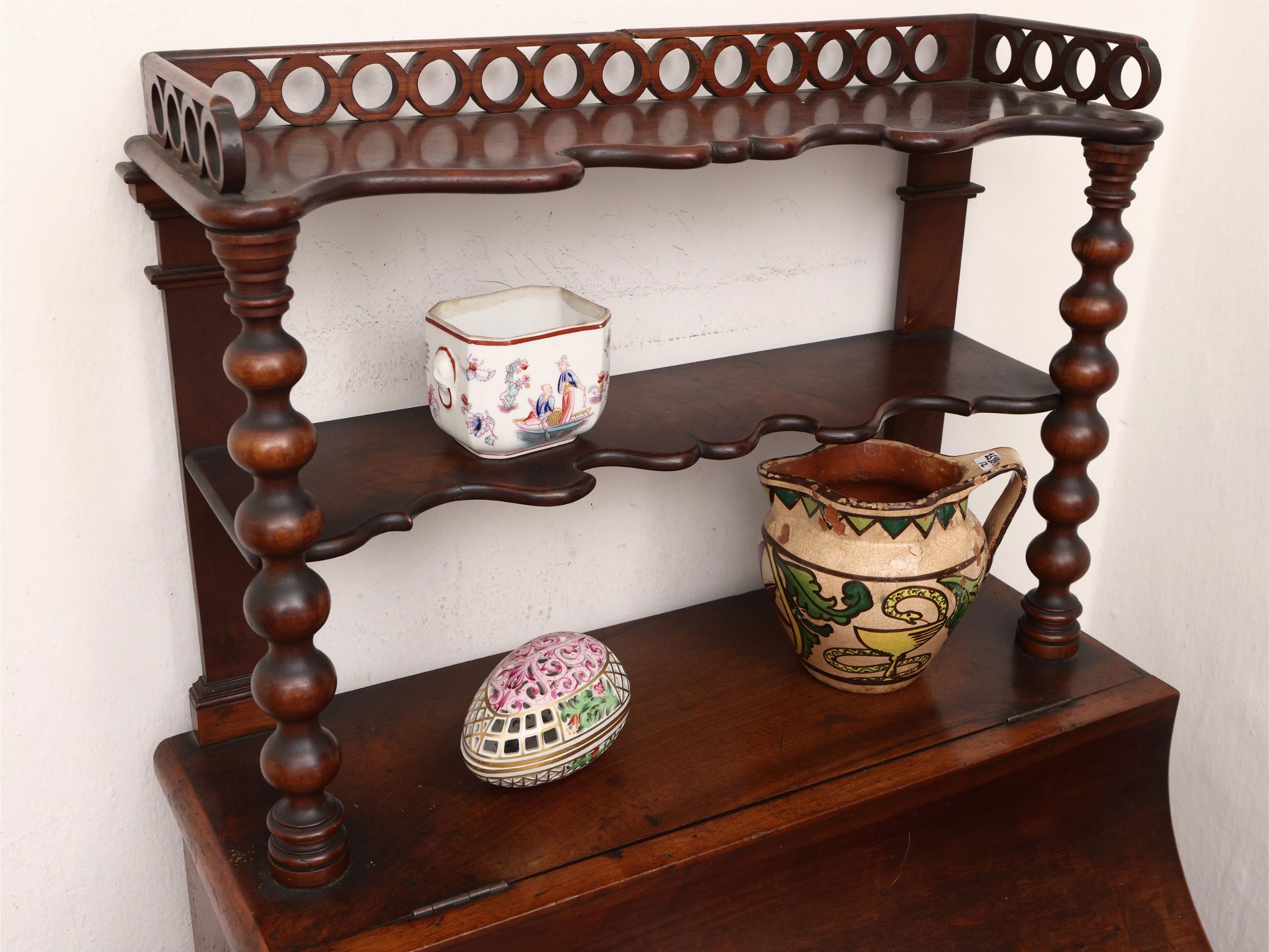 metà del XIX secolo sormontata da alzata con sostegni torniti e due scaffali, sportello concavo da alzarsi, piedi sagomati