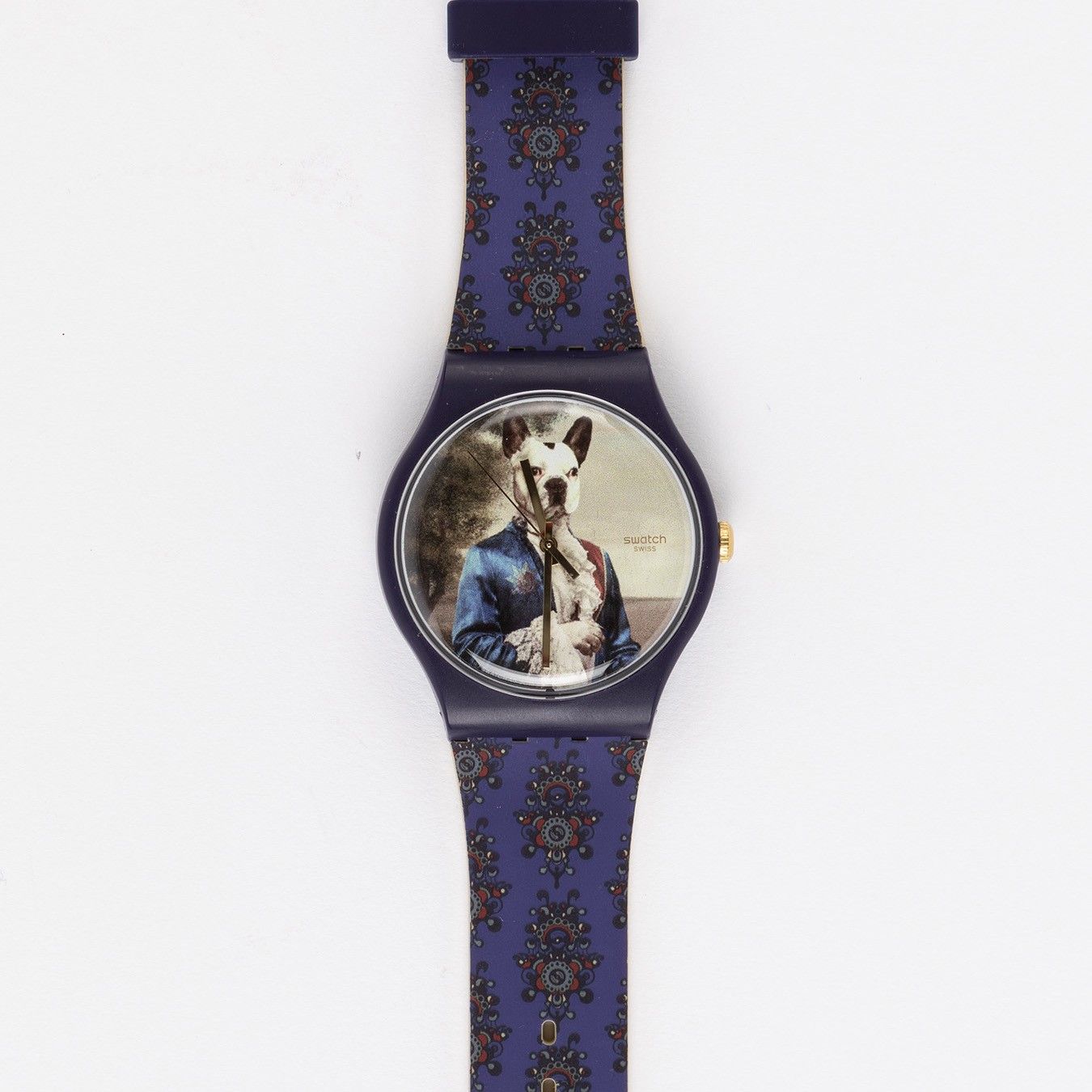 2016 SIR DOG (SUON120) è un orologio divertente con un cane regale stampato sul quadrante all'interno della cassa in plastica viola. Anche il cinturino è viola con una stampa colorata ed è completato dalla fibbia e dal passante in tono.