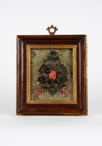 h cm 11,3 x l 11, 2 x p 1,2; g. 83 in cornice di filigrana d'argento, con roselline in corallo