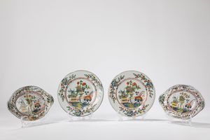 Coppia di piatti rotondi e coppia di piattini ovali, decoro a giardinetto. Manifattura [..]