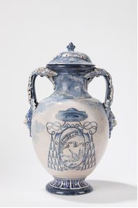 Vaso biansato in ceramica bianca e blu di Savona. Secolo XIX