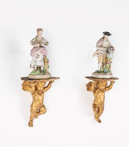 Due figure in porcellana con mensole in legno, secolo XX