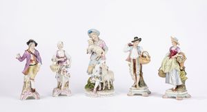 Cinque sculture in porcellana policroma raffiguranti personaggi, manifatture diverse [..]