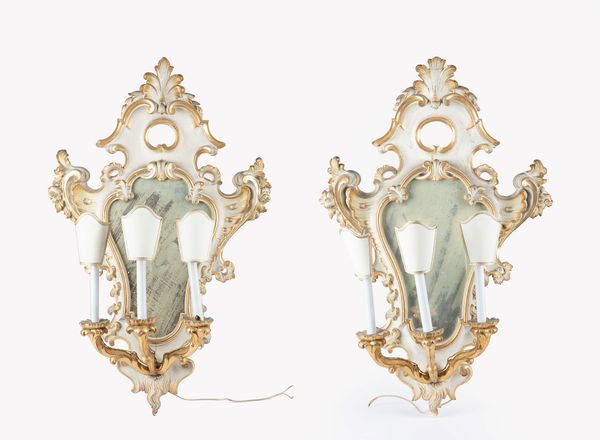 Coppia di ventoline in legno laccato e parzialmente dorato, fine secolo XIX/ inizio [..]