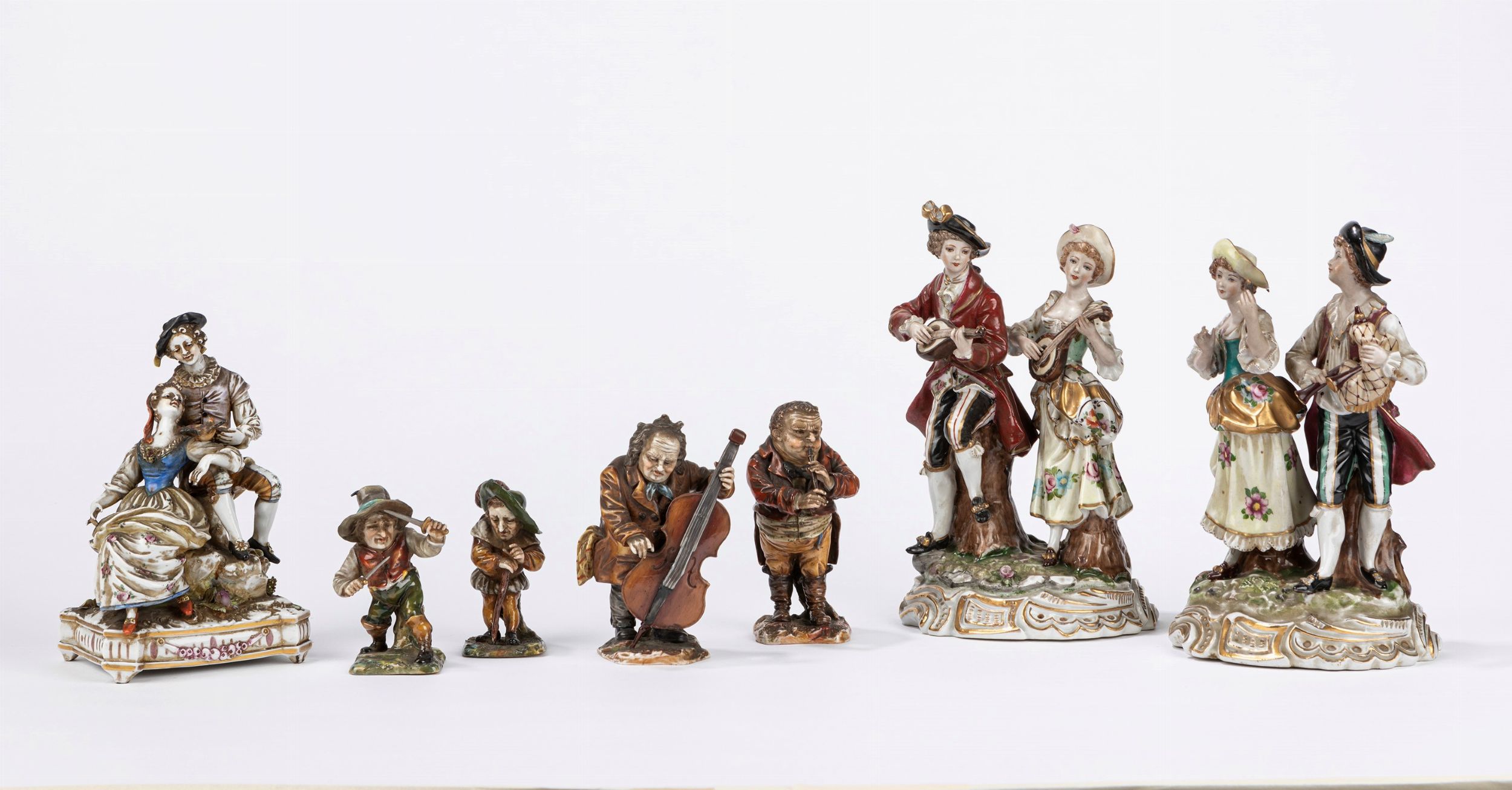 Gruppo di sette sculture in porcellana, manifatture e soggetti diverse