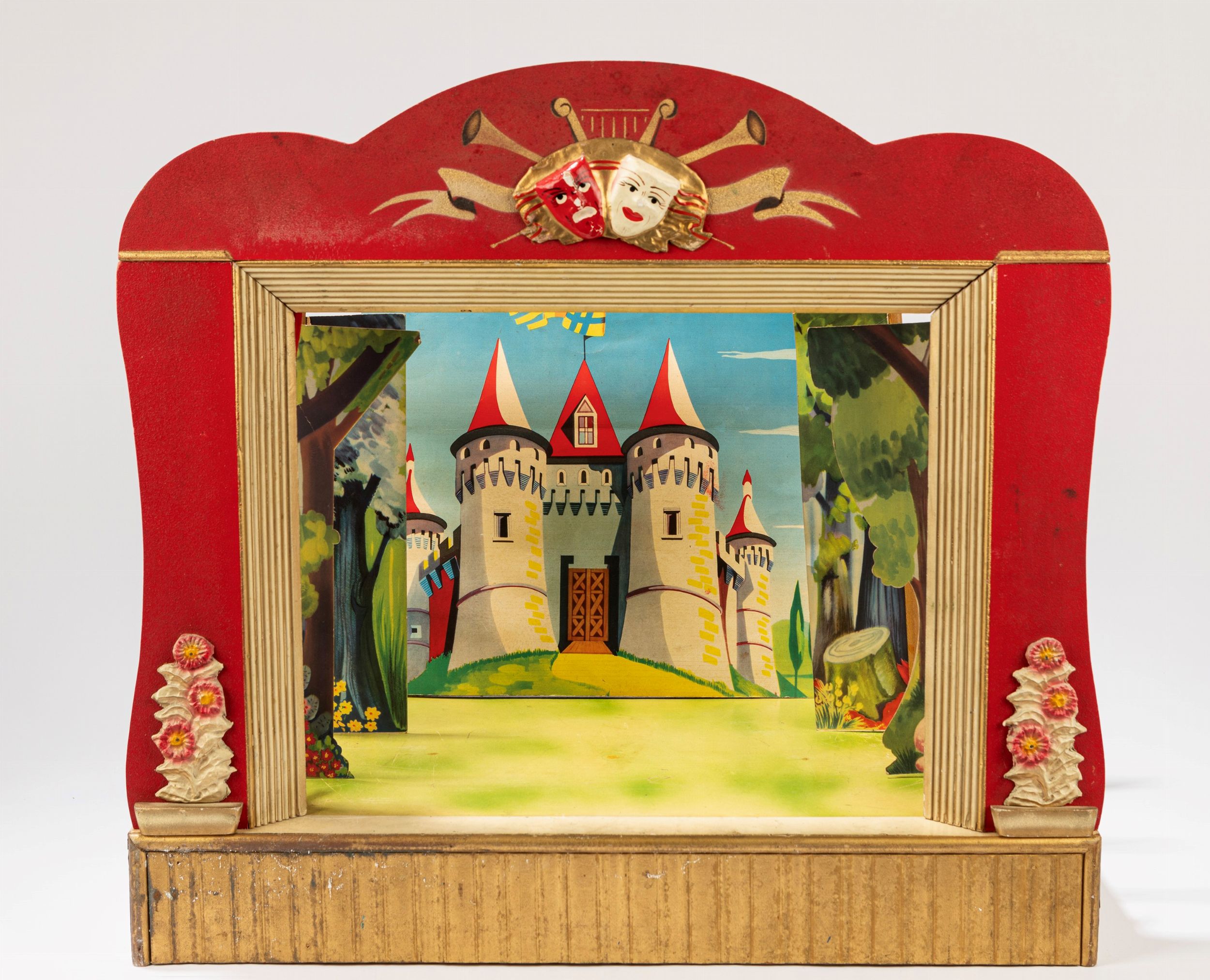 Teatro in legno con sipario in tessuto con 2 fondali e quinte. Completo di 16 marionette (alcune con parti mancanti)