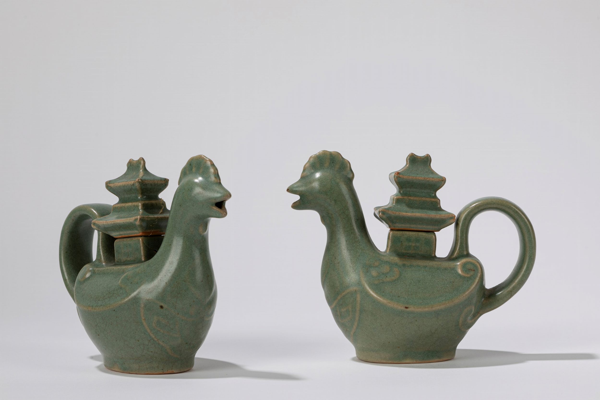 Coppia di versatoi in ceramica a invetriatura celadon. Cina, secolo XX