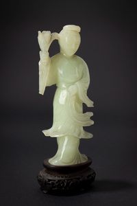 h cm 20 raffigurante dama con ventaglio (base in legno) 持扇仕女绿玉凋 (木底座)